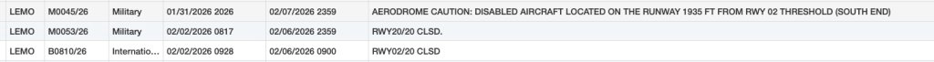 On Monday, the FAA issued two more NOTAMs, notifying pilots that both the military and civilian runways at the facility would be closed until Feb. 6.