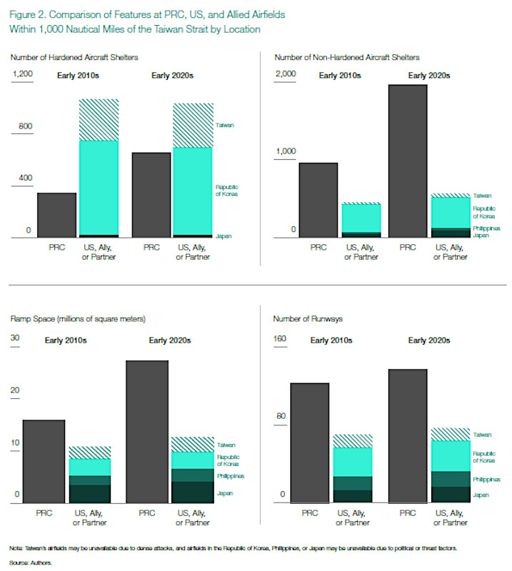 “The U.S. Department of Defense (DoD) has consistently expressed concern regarding threats to airfields in the Indo-Pacific, and military analyses of potential conflicts involving China and the United States demonstrate that the overwhelming majority of US aircraft losses would likely occur on the ground at airfields (and that the losses could be ruinous),” the report says in its executive summary. “But the U.S. military has devoted relatively little attention, and few resources, to countering these threats compared to developing modern aircraft.”