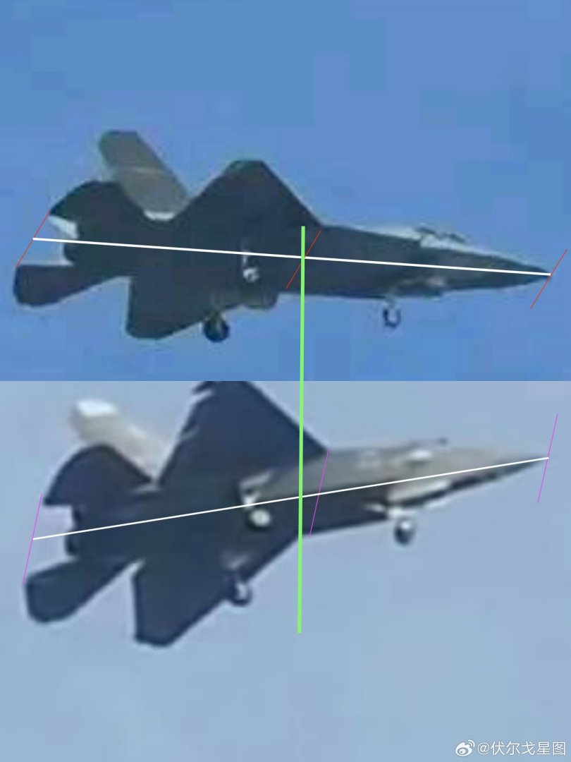 The main indicators that this is likely not another prototype for the carrier-based J-35 include a smaller overall wing surface area. While on the J-35 the horizontal tail surfaces ‘cut into’ the wing, on the apparent J-31 there is clearly a small gap between the surfaces. At the same time, this area is different from that of the two FC-31 demonstrators.