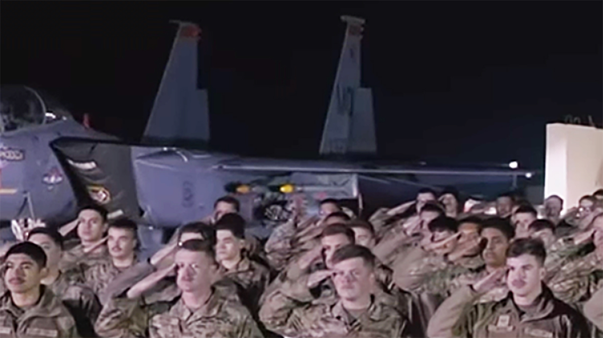 The video shows three F-15Es behind dozens of airmen from the 332nd during the national anthem, which you can see at the 1:37 mark.