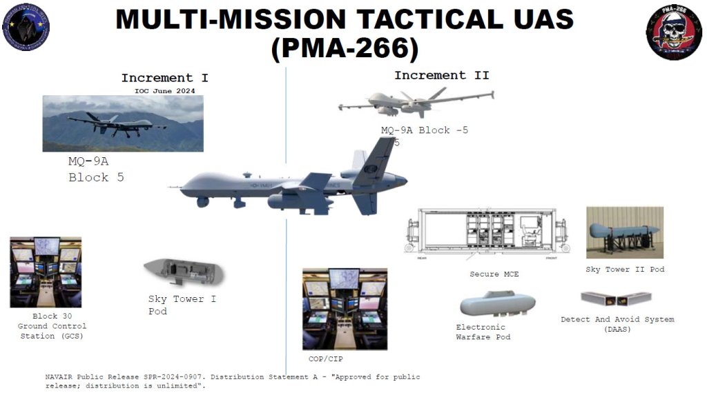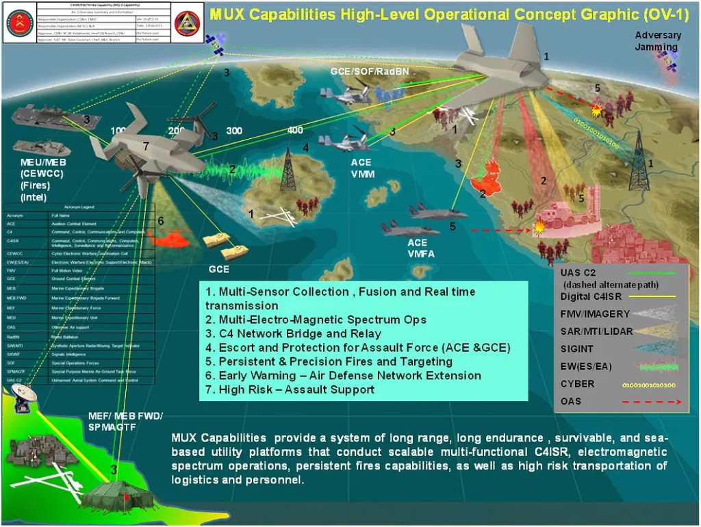 The Marine Corps’ original vision for the MUX concept, outlined in the late 2010s, consisted of multiple advanced drone types capable of performing airborne early warning, air reconnaissance, electronic warfare, communications relay, offensive air support, scout and aerial escort, and cargo carrying missions. The Marines subsequently scaled back their near-term uncrewed aviation plans significantly and acquired the MQ-9 as the initial MUX platform.