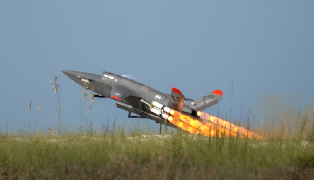 The rocket boosters can be seen falling away after the launch of an XQ-58 in the video below.