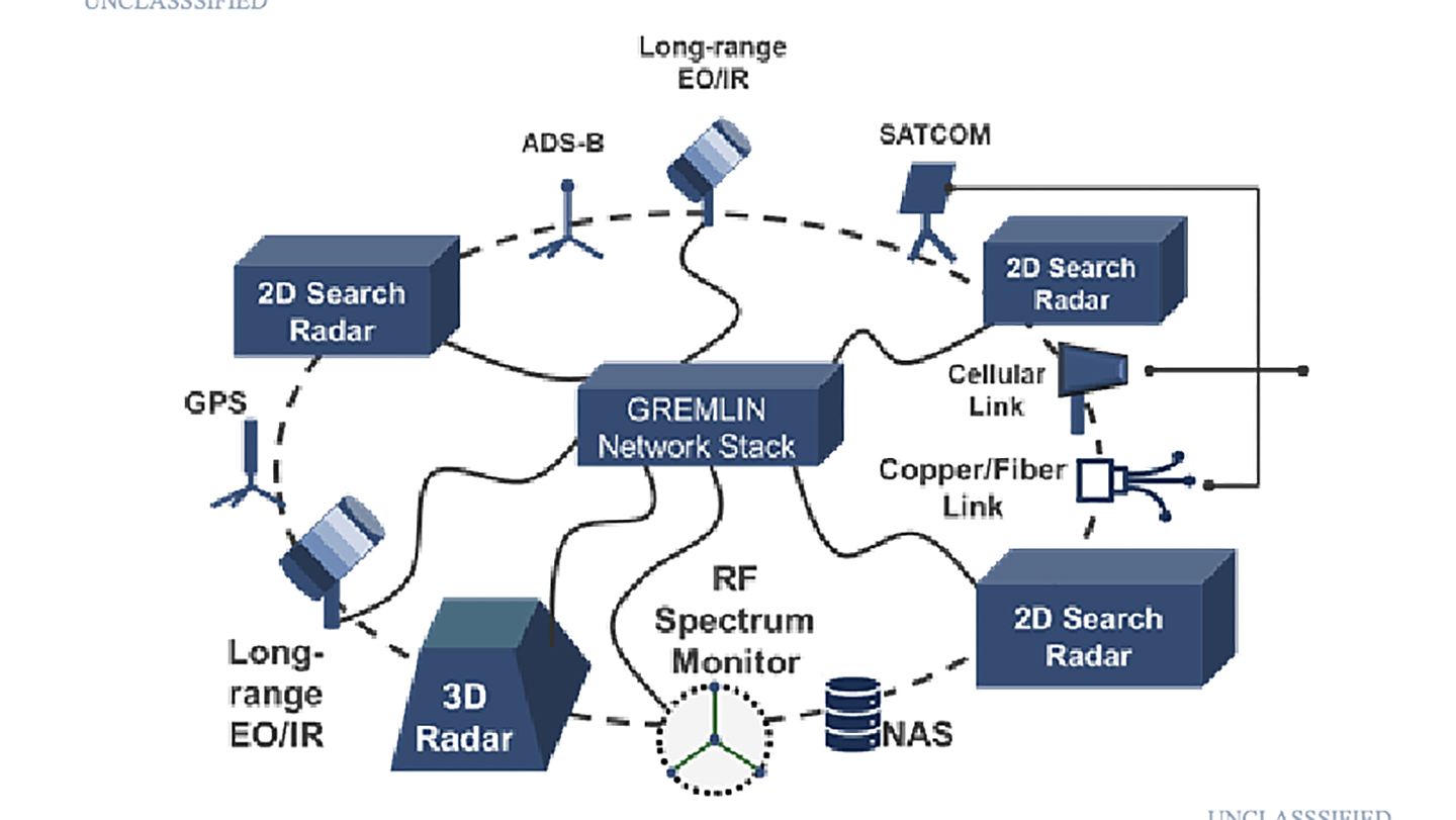 Now deployed, GREMLIN includes 2D and 3D radars, long-range electro-optical/infrared sensors, GPS, satellite communications, aircraft tracking systems and radio frequency spectrum monitoring. It all feeds into a central node where the data can be fused to get a better sense of what’s out there. The system is something of an integrated air defense apparatus ‘in a box,’ allowing for multiple sensor types and open-source data to be captured on single targets within its view.