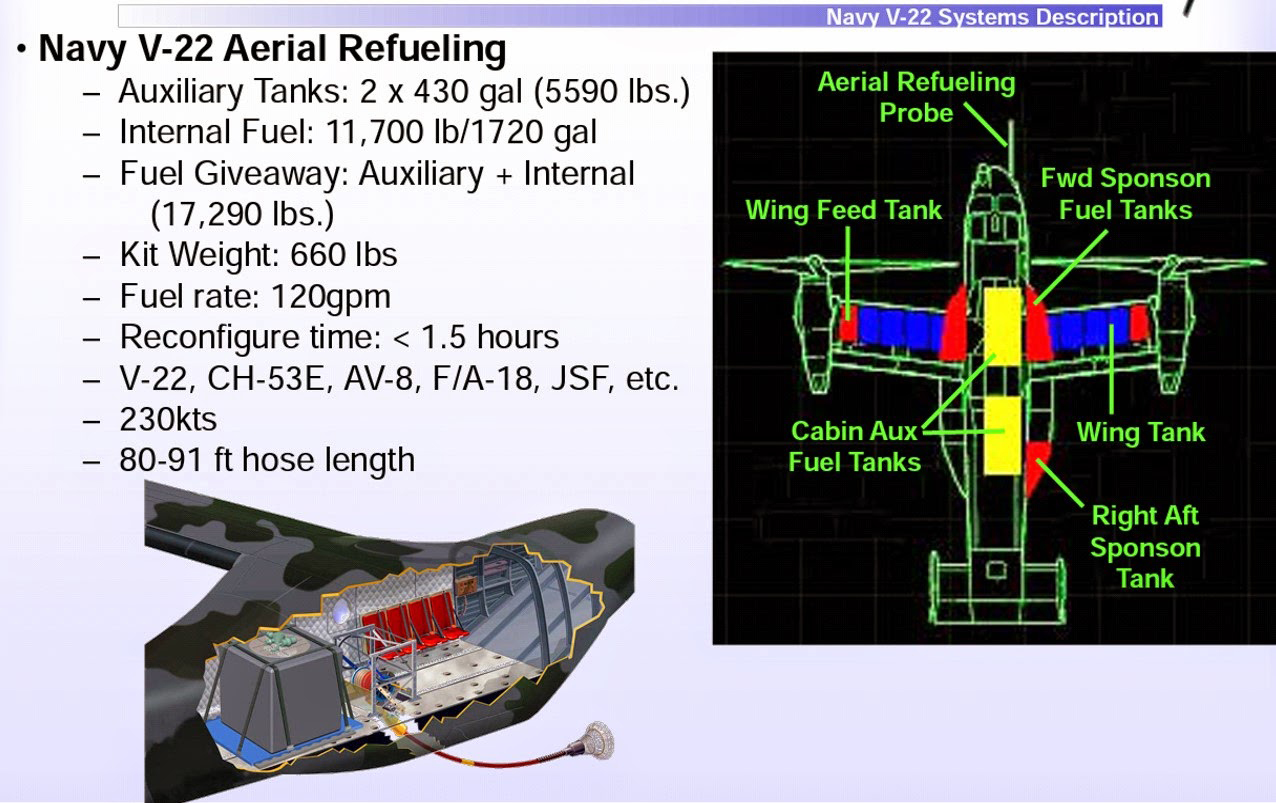 The prototype of the V-22 Aerial Refueling System (VARS) was first tested in 2013, with its cabin-mounted drogue and hose unit successfully being deployed with F/A-18 Hornets in tow. The capability was supposed to be ready for operational use by 2017 and it was seen as critical to giving Marine aircraft, including other MV-22s, as well as AV-8Bs and F-35B/Cs, and even CH-53s, extended range, especially when operating from amphibious assault ships and remote locales, such as island airstrips.