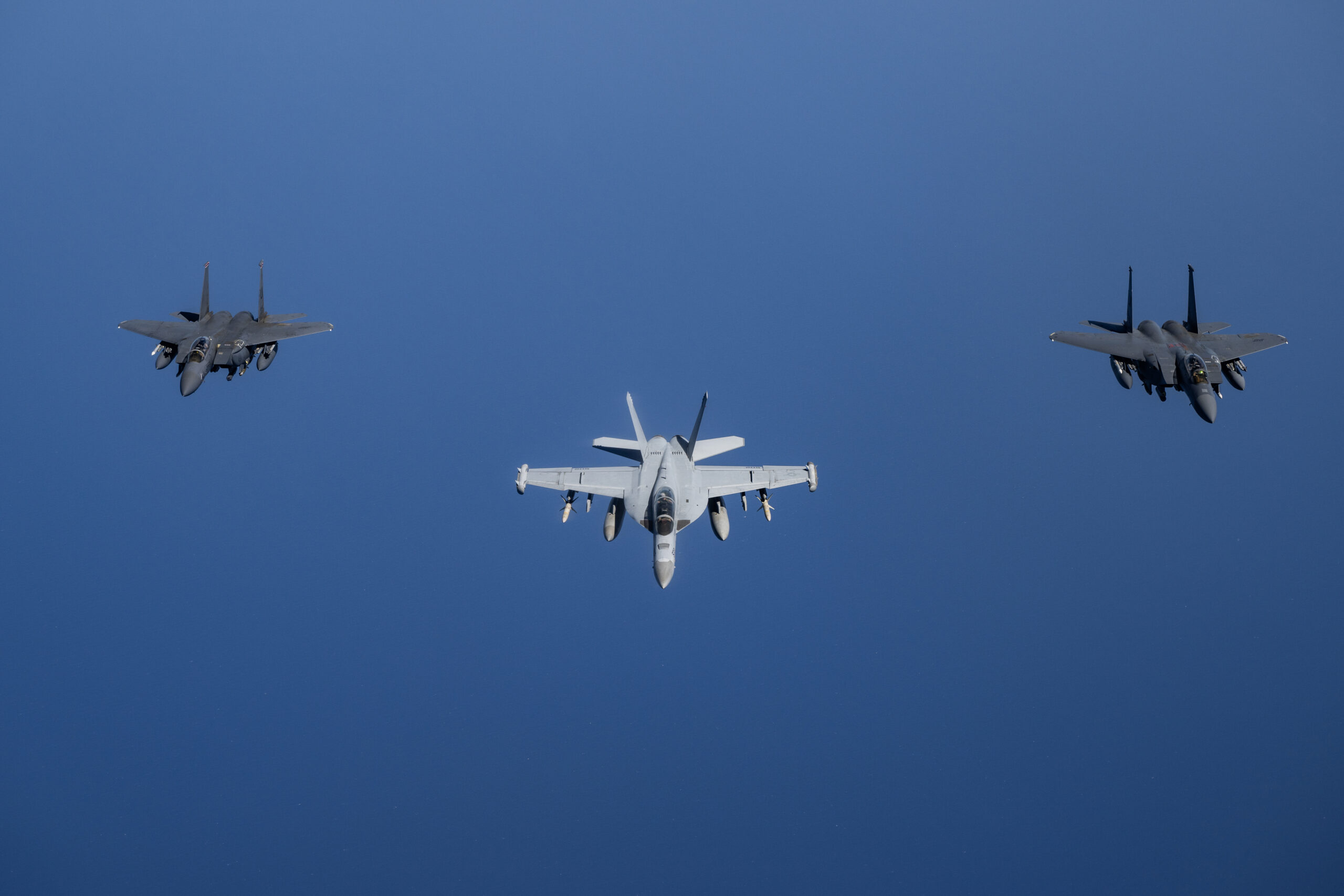 It’s worth noting that aircraft in the carrier’s air wing will sometimes detach to land bases for forward operations. This is especially true for the electronic attack community. This image could have been taken under other circumstances, as well. In this case, additional images showing the Growlers operating with F-15Es, which have been flying primarily out of their forward base in Jordan, points to that being the case.