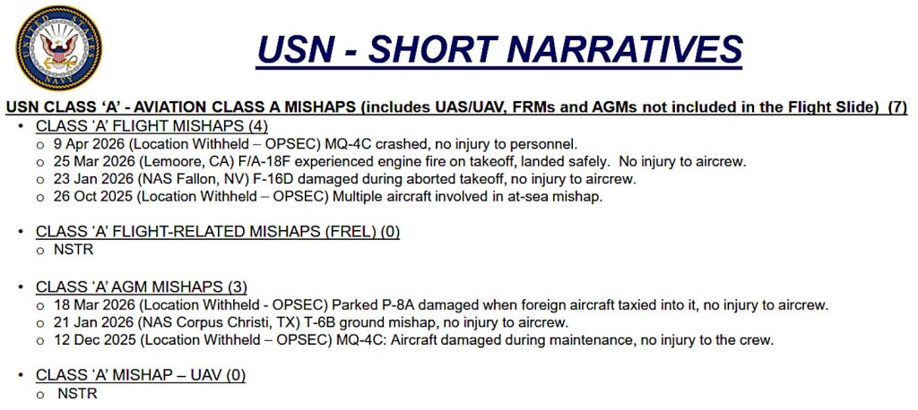 “9 Apr 2026 (Location Withheld – OPSEC [Operational Security]) MQ-4C crashed, no injury to personnel.”