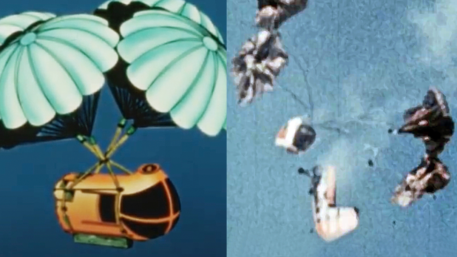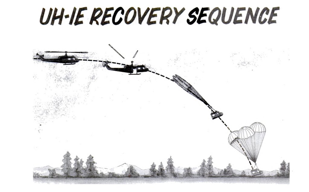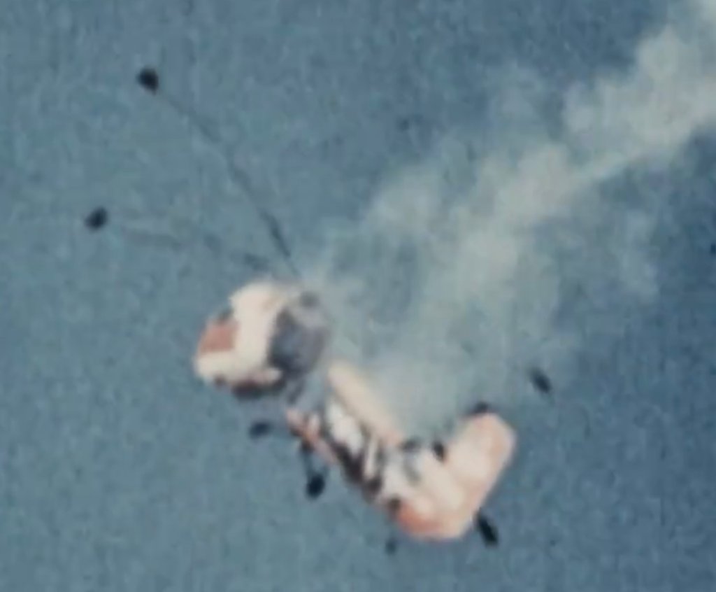 Detonating chord leads were used to sever the helicopter’s rotors and blast them out of the way, thus preventing them from interfering with the deployment of the capsule’s parachutes.