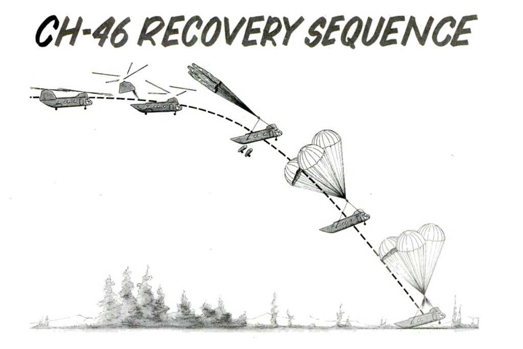 While footage of Navy testing with CH-46s does not appear to exist, an illustration from the service’s subsequent research seen below shows the rear rotor nacelle and both rotors being blown completely off — allowing the entire airframe to be parachuted to the ground.