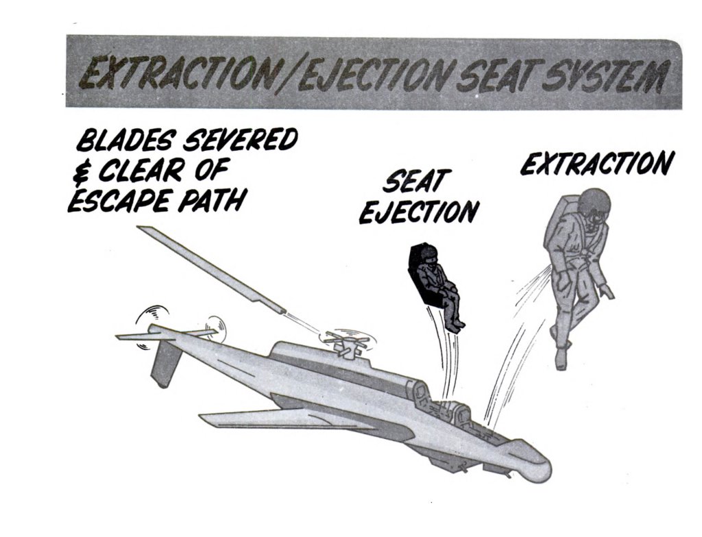 The system involved placing roughly 18 feet of continuous, aluminum-sheathed linear charge around the inside of the helicopter to sever the escape module from the rest of the fuselage. Two modified catapult rocket launchers, mounted aft on the port and starboard sides, were also used to ensure the escape module’s separation from the rest of the aircraft.