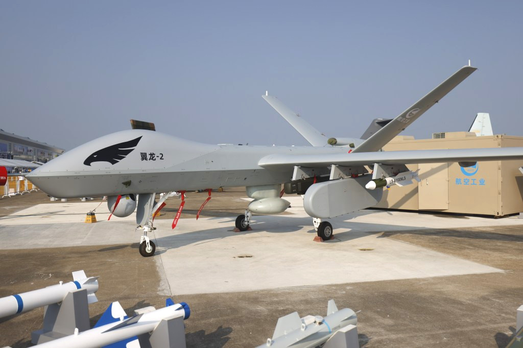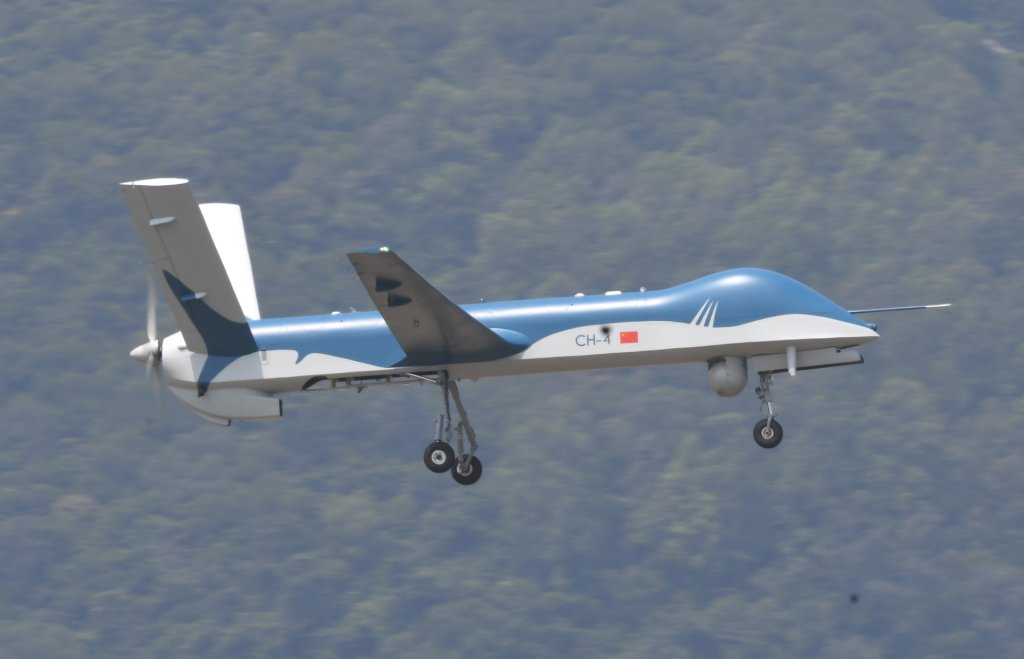 Though the resolution of the satellite image is low, what look to be GJ-11 Sharp Sword stealthy flying-wing uncrewed combat air vehicles (UCAV), as well as what may be either Wing Loong or CH-4/5 Rainbow-series medium-altitude long-endurance (MALE) types, are present. A BZK-005, another MALE design, looks to be visible, too.