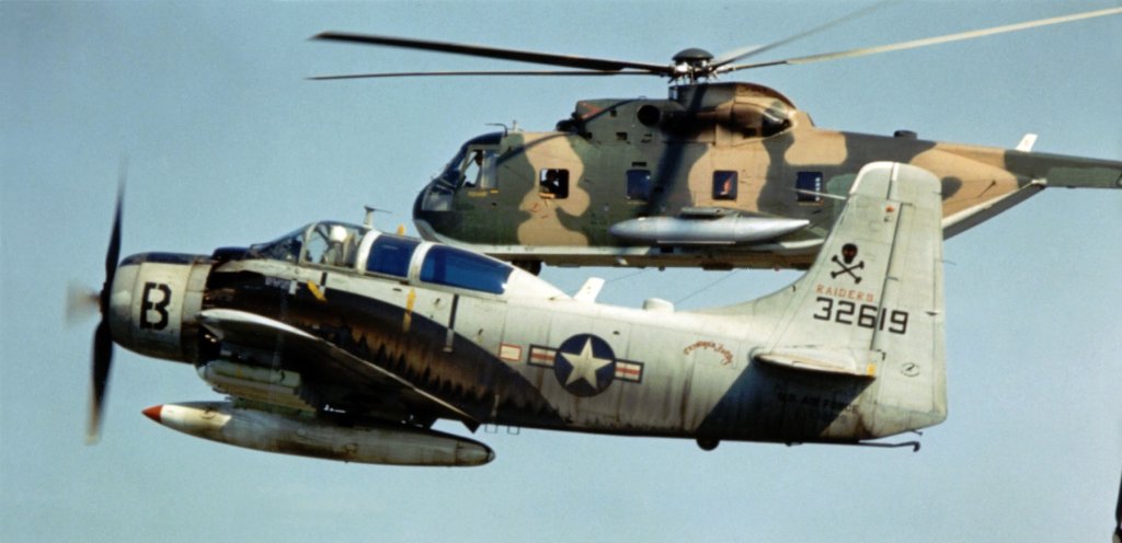 The Navy and Marines continued to fly A-1s into the Vietnam War. The Air Force also acquired and flew hundreds of single and multi-seat Skyraider variants second-hand during the conflict in Southeast Asia. Air Force A-1s were heavily employed as escorts for helicopters during search and rescue missions, commonly referred to as the “Sandy” mission, and in support of special operations forces. The Skyraider’s ability to fly low and slow, as well as loiter for extended periods over a particular area, along with its large and diverse ordnance capacity, made it especially attractive for these roles.