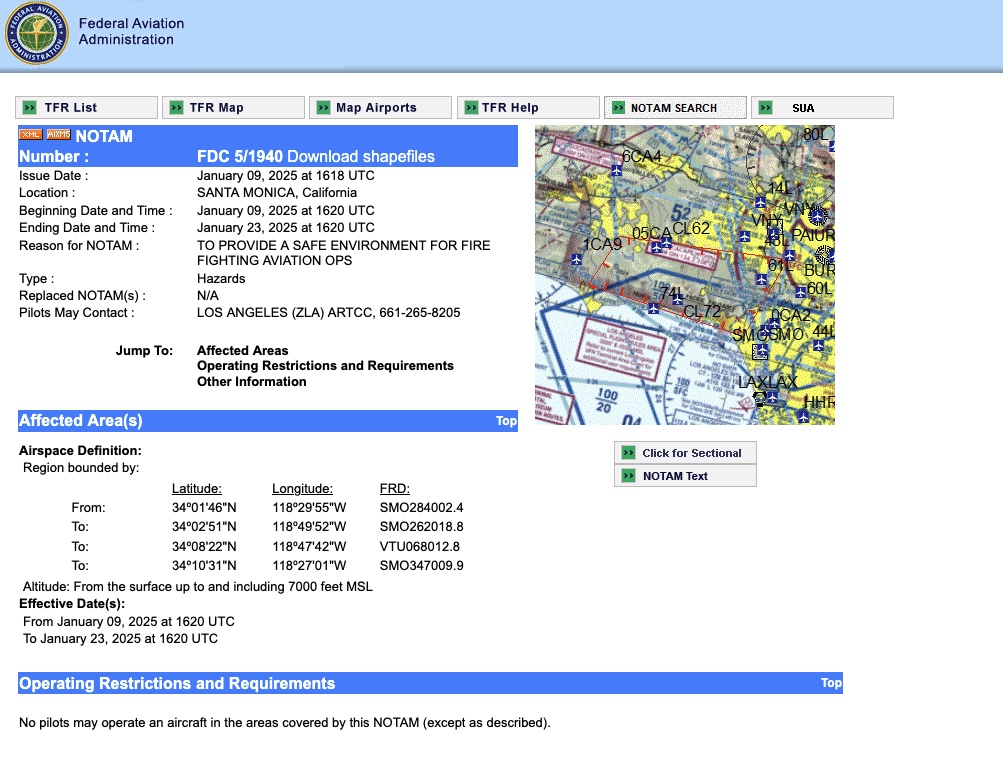 “It’s a federal crime, punishable by up to 12 months in prison, to interfere with firefighting efforts on public lands,” the FAA said in a statement. “Additionally, the FAA can impose a civil penalty of up to $75,000 against any drone pilot who interferes with wildfire suppression, law enforcement or emergency response operations when temporary flight restrictions (TFRs) are in place. The FAA treats these violations seriously and immediately considers swift enforcement action for these offenses. The FAA has not authorized anyone unaffiliated with the Los Angeles firefighting operations to fly drones in the TFRs.”