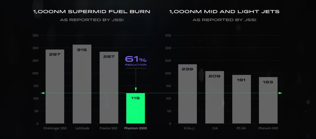 In the video, Otto CEO Touw says the Phantom 3500 is expected to burn 115 gallons of fuel per hour. The average burn rate for other comparable business jets like the Bombardier Challenger 350, Cessna Citation Latitude, and Embraer Praetor 500 is around 300 gallons per hour, according to the company, citing data from Jet Support Services, Inc. (JSSI).
