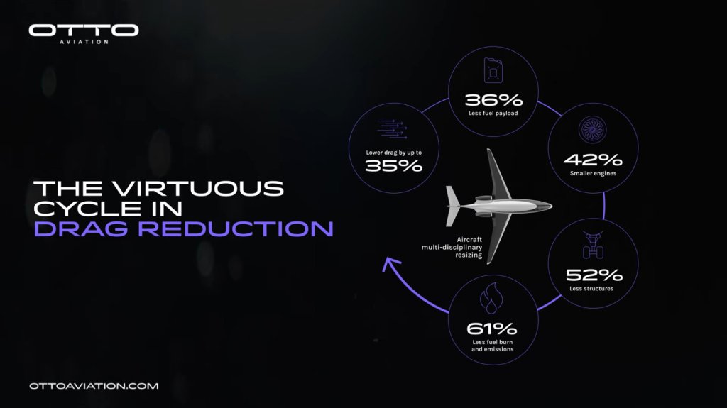 “Virtuous cycle is the synthesis cycle of aircraft design. The virtuous cycle that we use, you take laminar flow, apply it to your design, and your drag goes down. When your drag goes down, your fuel burn goes down. When your fuel burn goes down, fuel required goes down,” Scott Drennan, Otto’s president and chief operating officer, explains in the video released earlier this month. This, in turn, allows for “smaller engines, smaller structure to support all that, and it starts to loop down that curve, so you have a lighter, high performance aircraft that still meets all the customer experience expectations.”