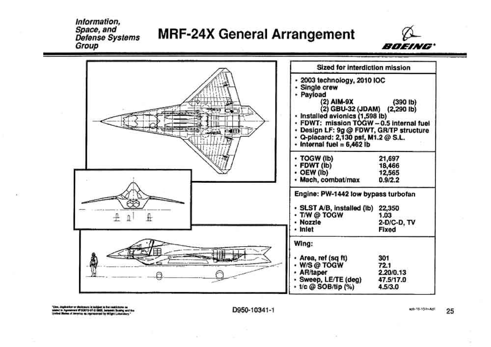 A Boeing design study, labeled MRF-24X, and reproduced below, shows a tailless fighter-like platform with a single engine and an X-32-style wing with significant anhedral. Presumably, like the X-36, it would have had an advanced thrust-vectoring engine nozzle to assist in directional control. Once again, however, we don’t know for sure what the YF-24 exactly looked like, if it did indeed exist at all.