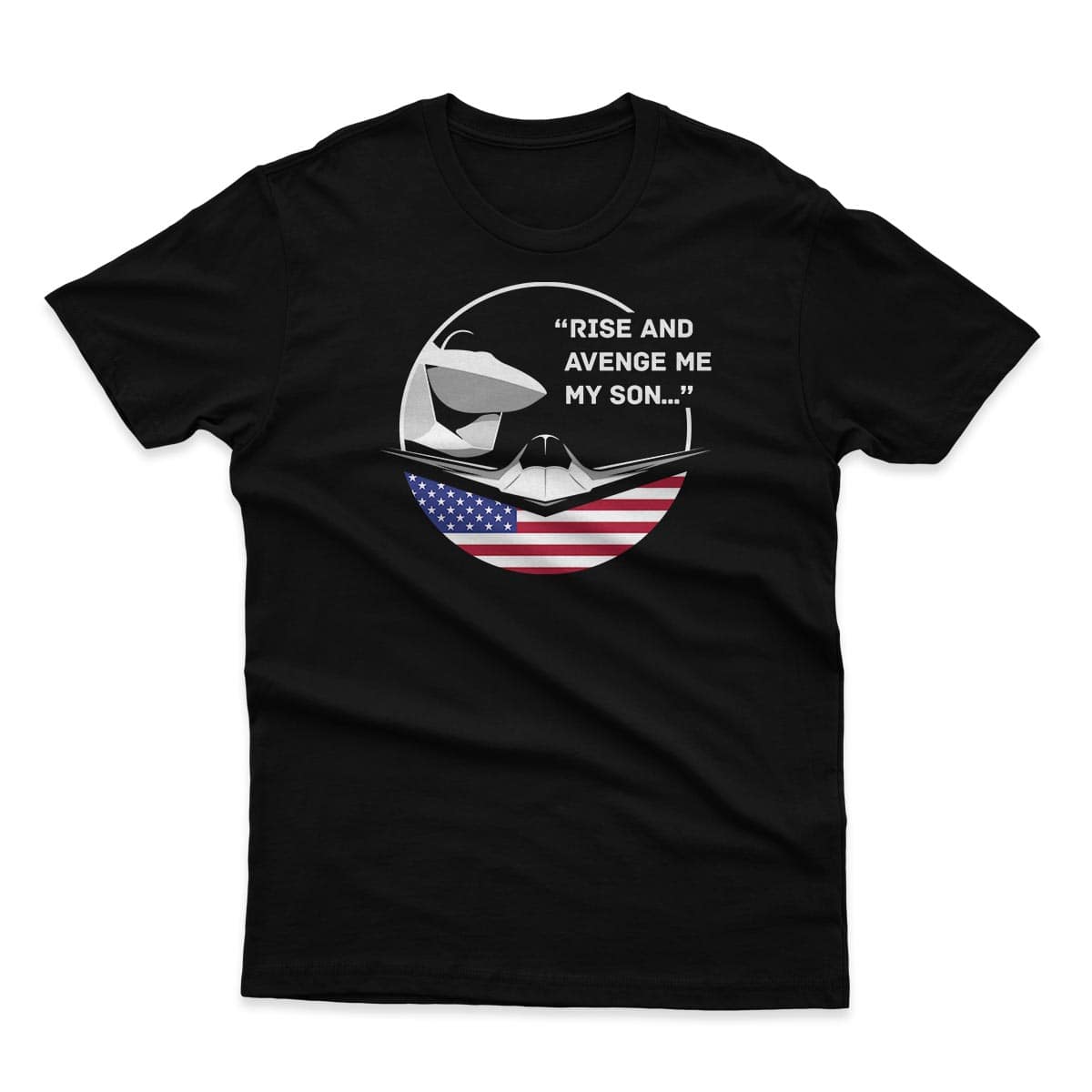 The shirt was born from a meme I created that made its rounds on social media shortly after the F-47 contract award to Boeing. In it, we see the F-47 in a flag-draped hangar with the X-32 looming over it, giving a command of family vengeance: “Rise and avenge me my son…” Now, we are recreating it in stylized wearable fashion!