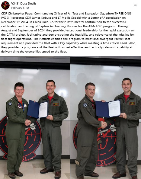 On the AIM-174B front, “CDR Christopher Putre, Commanding Officer of Air Test and Evaluation Squadron THREE ONE (VX-31) presents CDR James Kobyra and LT Mollie Sebald with a Letter of Appreciation on December 19, 2024, in China Lake, CA for their instrumental contribution to the successful certification and testing of Captive Air Training Missiles [CATM]” in support of that program, a separate VX-31 Facebook post says. “Through August and September of 2024, they provided exceptional leadership for the rapid execution on the CATM project, facilitating and demonstrating the feasibility and relevance of the missiles for fleet flight operations. Their efforts enabled the program to meet and [sic; an] emergent Pacific Fleet requirement and provided the fleet with a key capability while meeting a time critical need. Also, they provided a program and the fleet with a cost effective, and tactically relevant capability at delivery time the exemplifies speed to the fleet.”