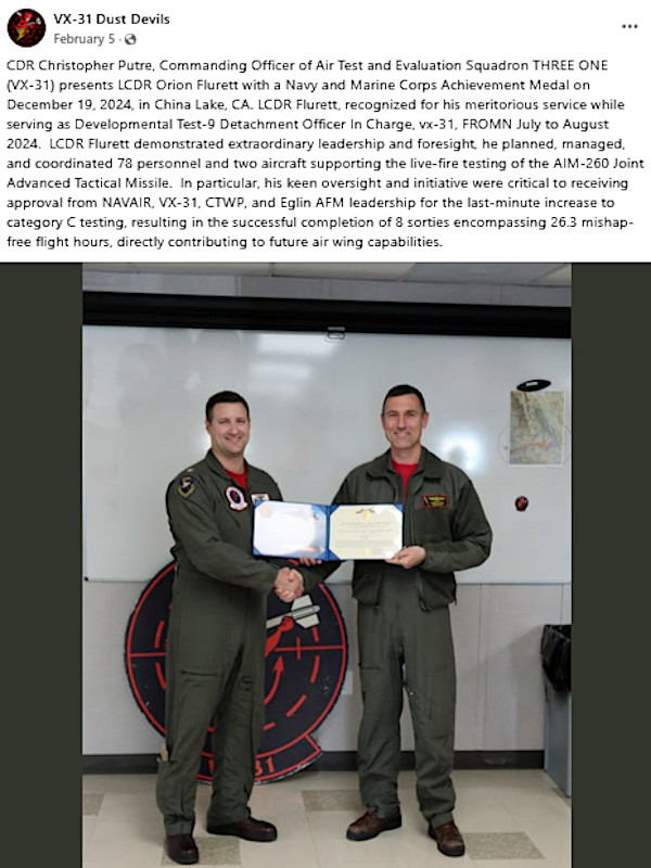“CDR Christopher Putre, Commanding Officer of Air Test and Evaluation Squadron THREE ONE (VX-31) presents LCDR Orion Flurett with a Navy and Marine Corps Achievement Medal on December 19, 2024, in China Lake, CA. LCDR Flurett, recognized for his meritorious service while serving as Developmental Test-9 Detachment Officer In Charge, VX-31, FROMN [sic; from] July to August 2024,” one post on VX-31’s official Facebook account reads. “LCDR Flurett demonstrated extraordinary leadership and foresight, he planned, managed, and coordinated 78 personnel and two aircraft supporting the live-fire testing of the AIM-260 Joint Advanced Tactical Missile. In particular, his keen oversight and initiative were critical to receiving approval from NAVAIR [Naval Air Systems Command], VX-31, CTWP, and Eglin AFM [sic; Eglin Air Force Base] leadership for the last-minute increase to category C testing, resulting in the successful completion of 8 sorties encompassing 26.3 mishap-free flight hours, directly contributing to future air wing capabilities.”
