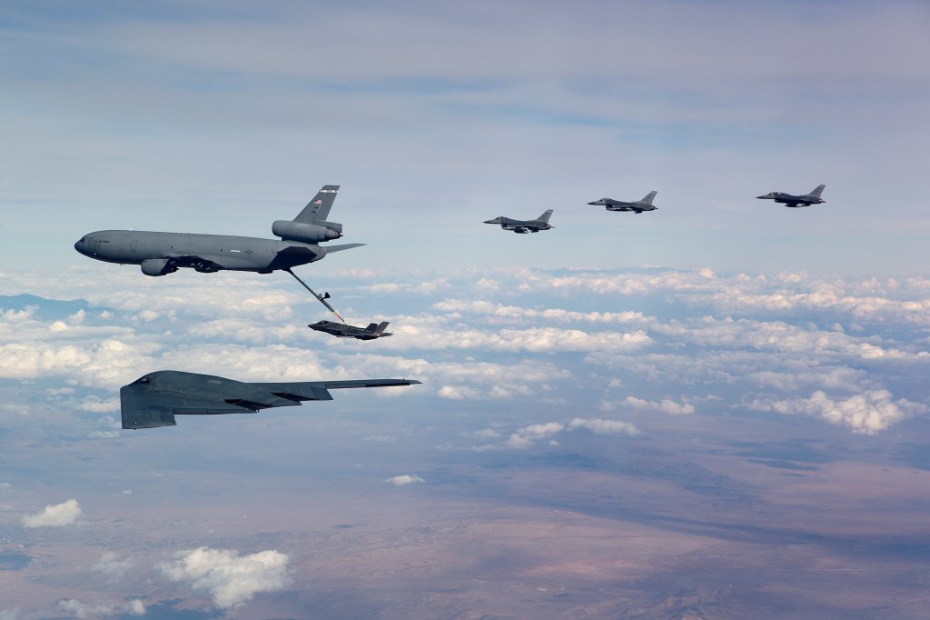 CT: I can go first again. It was when I was chasing a B-2. We’re out there doing a test mission and then it just, happened… There happened to be a KC-10 in the area. So like, “Hey, we’re gonna go get some plugs ’cause they need a proficiency.” And so they went and got some plugs on the airplane. And lo and behold there was a couple F-16s and an F-35 and there wound up being seven airplanes up in the sky at once. So I was able to capture that, Edwards in the background and flying over the mountains. It was definitely a unique day and when I got out of the airplane, I was like, “Man, that is a once-in-a-lifetime opportunity. I’m never going to get that many airplanes in the sky by happenstance.”