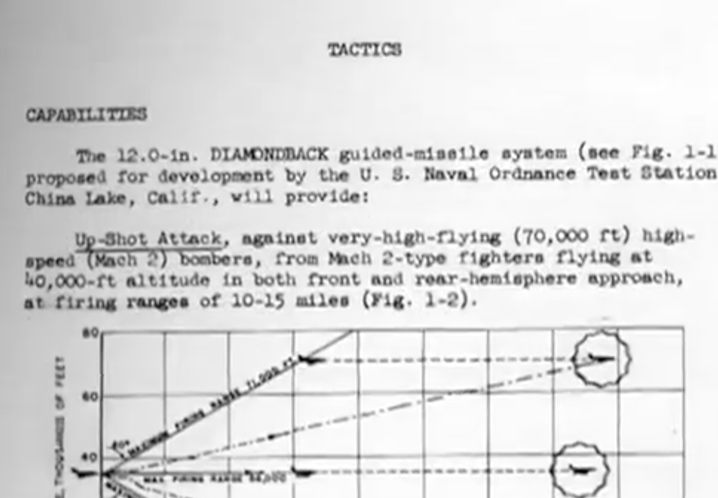 According to available accounts, the Diamondback studies at NOTS were generally successful. However, work on the project had come to an end by around 1958. Apparently, the Navy saw little operational use for such a missile. This may well have been driven by the fact that it was the U.S. Air Force that had primary responsibility for the homeland defense mission, for which a heavy ‘bomber-killer’ type of missile was much better suited.