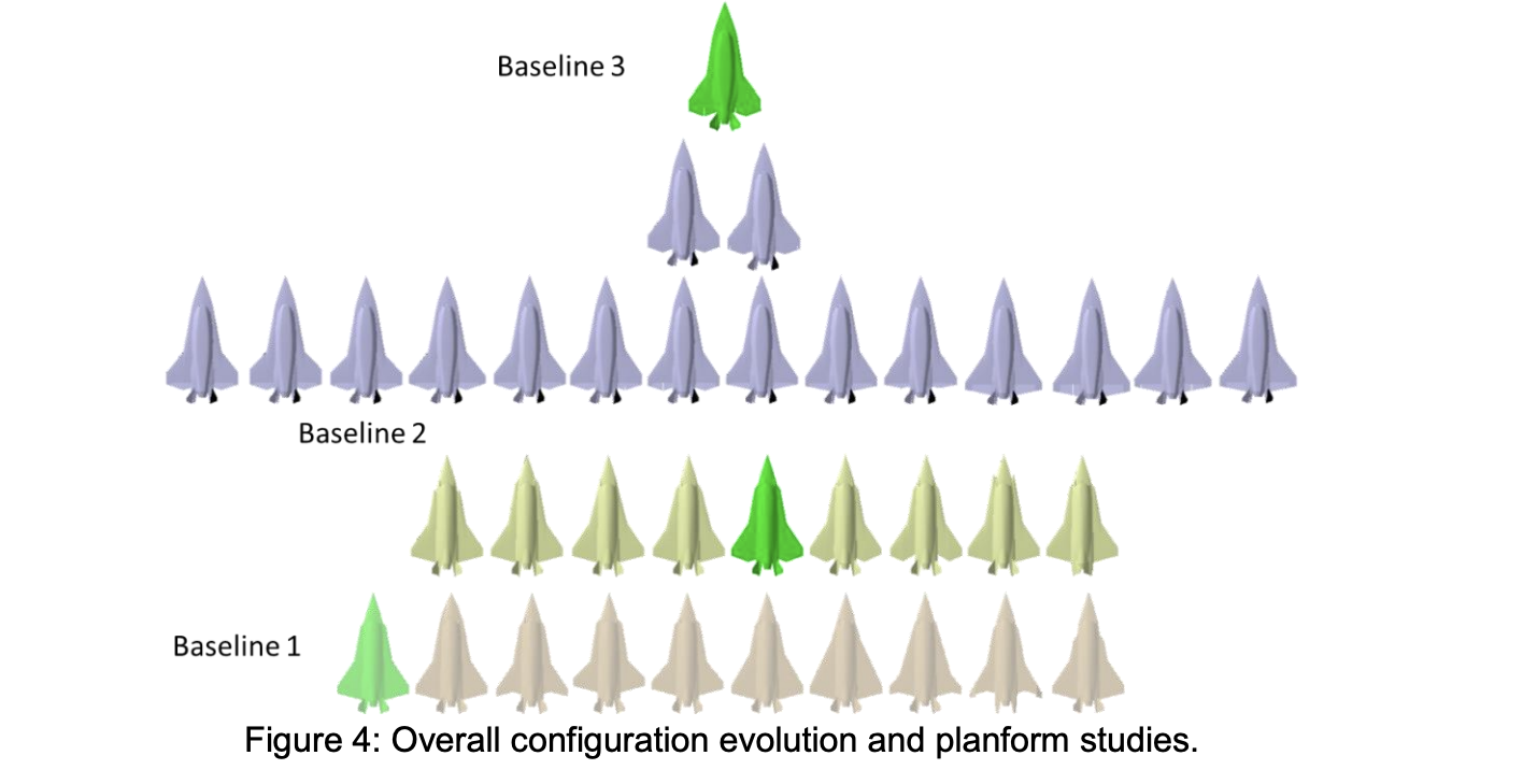 The evolution process is seen in Figure 4, below, starting with more significant variations toward the bottom and gradually refined shapes toward the top. “Shape evolution that can be seen between the different baselines is driven by more than aerodynamic considerations like radar signature, structural layout, and internal packing,” the report states.