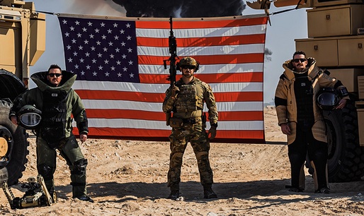 The picture, published on Jan. 10 by U.S. Air Forces Central Command (AFCENT), shows three squadron members, two wearing bomb suits, which are donned when remote manipulation of a device is not an option. Between them is an airman holding an M240 machine gun. They are standing in front of an American flag. Behind it, a ball of flames erupts in the wake of the detonation as a C-17 Globemaster III transport jet soars overhead.