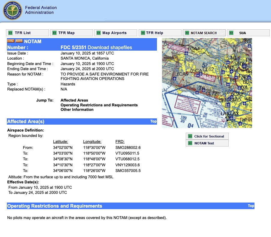“It’s a federal crime, punishable by up to 12 months in prison, to interfere with firefighting efforts on public lands,” the FAA said in a statement. “Additionally, the FAA can impose a civil penalty of up to $75,000 against any drone pilot who interferes with wildfire suppression, law enforcement or emergency response operations when temporary flight restrictions (TFRs) are in place. The FAA treats these violations seriously and immediately considers swift enforcement action for these offenses. The FAA has not authorized anyone unaffiliated with the Los Angeles firefighting operations to fly drones in the TFRs.”