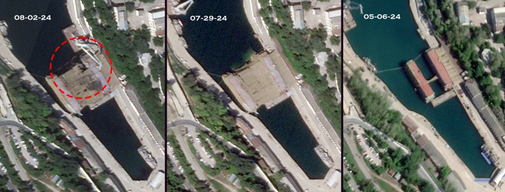 Ukraine provided no visual proof of the submarine being sunk. However, satellite imagery obtained by The War Zone shows that a peculiar floating installation at Sevastopol’s port, one that only came into being in the last few months, was clearly damaged within the last 48 hours. The facility is nestled deep in one of the bay’s fingers and was constructed using two barges with a roof-like covering strung between them. This is where some claim the submarine was being worked on at the time of the strike, although we cannot confirm that.