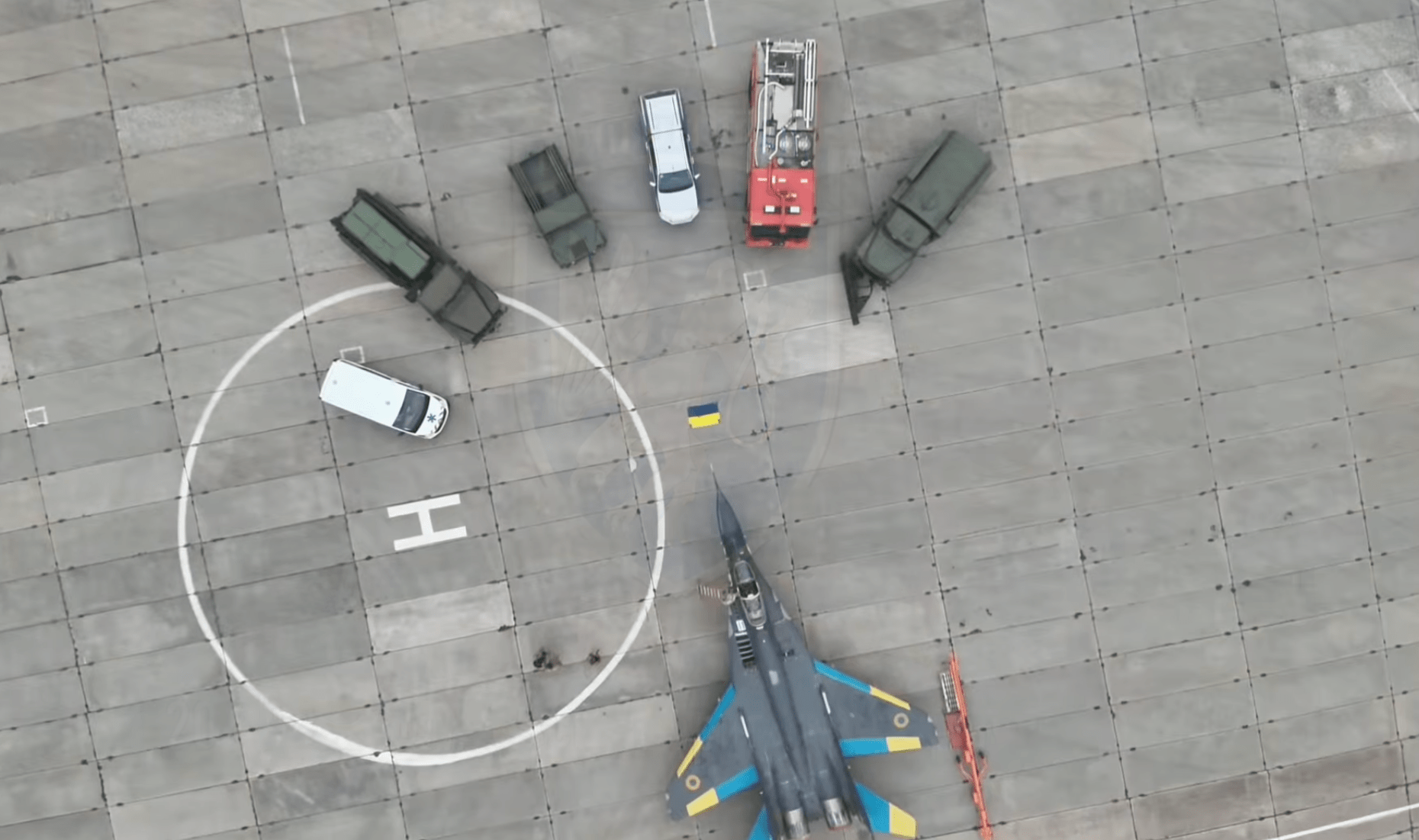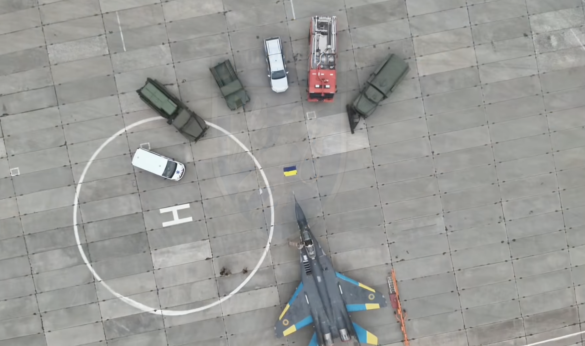 The footage was posted to Facebook on the official account of the Ukrainian Air Force’s 204th Tactical Aviation Brigade. The aircraft is shown from above, as well as filmed on the ground surrounded by various support vehicles (of Soviet and Western origin) as well as members of the various personnel groups who support the brigade’s wartime operations.