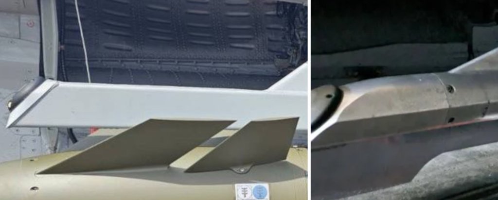 The pylon that the Hammer is hanging off of has a notable protrusion that extends forward of where the bomb is attached, which has a black-colored antenna at the tip. Overall, the pylon has the same general look as one previously seen on another Ukrainian MiG-29 with a JDAM-ER loaded onto it, which also had an extremely similar, if not identical feature installed at the end of a taper extension in front.