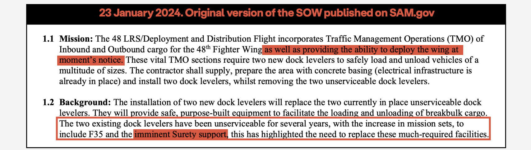 The reference to the 48th SFS resulted in The Telegraph newspaper in the United Kingdom publishing a story in January last year under the title “U.S. to station nuclear weapons in U.K. to counter threat from Russia.” This same story also highlighted references in a Pentagon Statement of Work to “imminent surety support” at Lakenheath. Once the story was published, this detail was removed from the same Statement of Work. The original version (annotated by FAS researchers) is provided below.