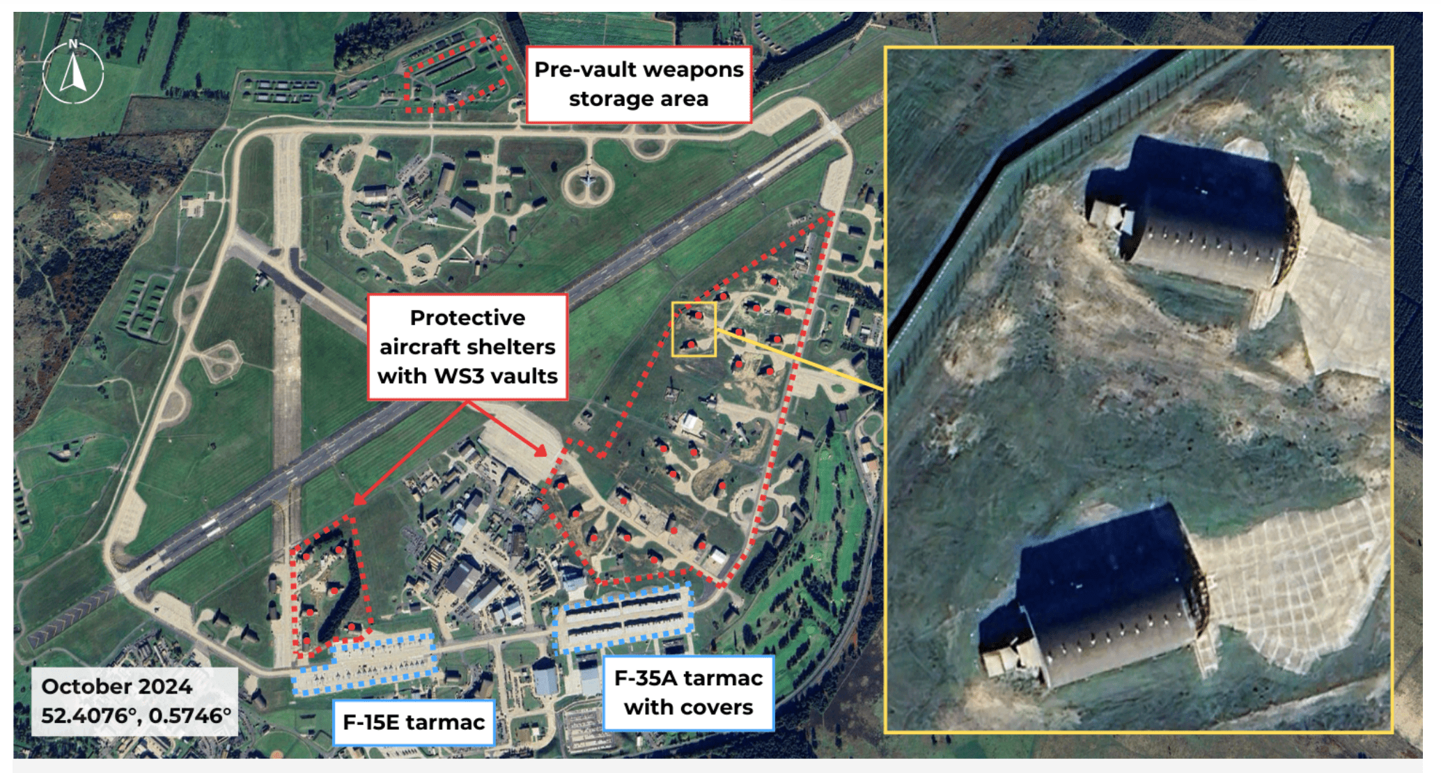 Most obviously, satellite imagery shows the ongoing upgrades being made to Lakenheath’s Protective Aircraft Shelters, which incorporate underground WS3 vaults for the storage of nuclear bombs. This work began in 2022, and, to date, around 28 of the 33 aircraft shelters have been upgraded, with construction continuing on six more.