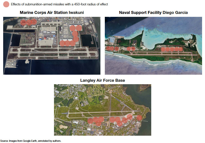 Just in January, the Hudson Institute think tank in Washington, D.C., published a report warning that a lack of hardened and unhardened aircraft shelters, as well as other exposed infrastructure, at bases across the Pacific and elsewhere globally have left the U.S. military worryingly vulnerable. The report’s authors assessed that just 10 missiles with warheads capable of scattering cluster munitions across areas 450 feet in diameter could be sufficient to neutralize all aircraft parked in the open and critical fuel storage facilities at key airbases like Marine Corps Air Station Iwakuni in Japan, Naval Support Facility Diego Garcia in the Indian Ocean, or Langley Air Force Base in Virginia.