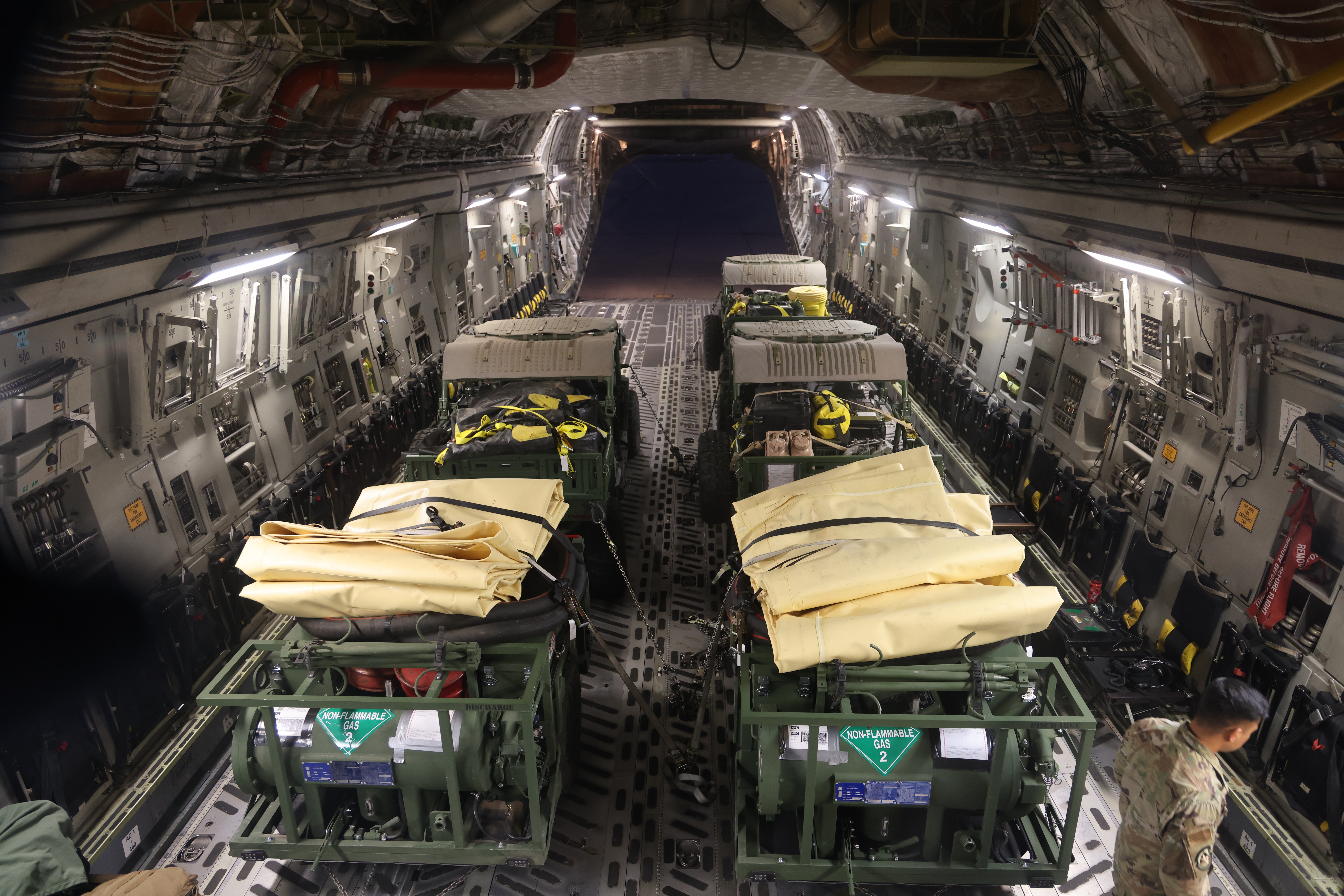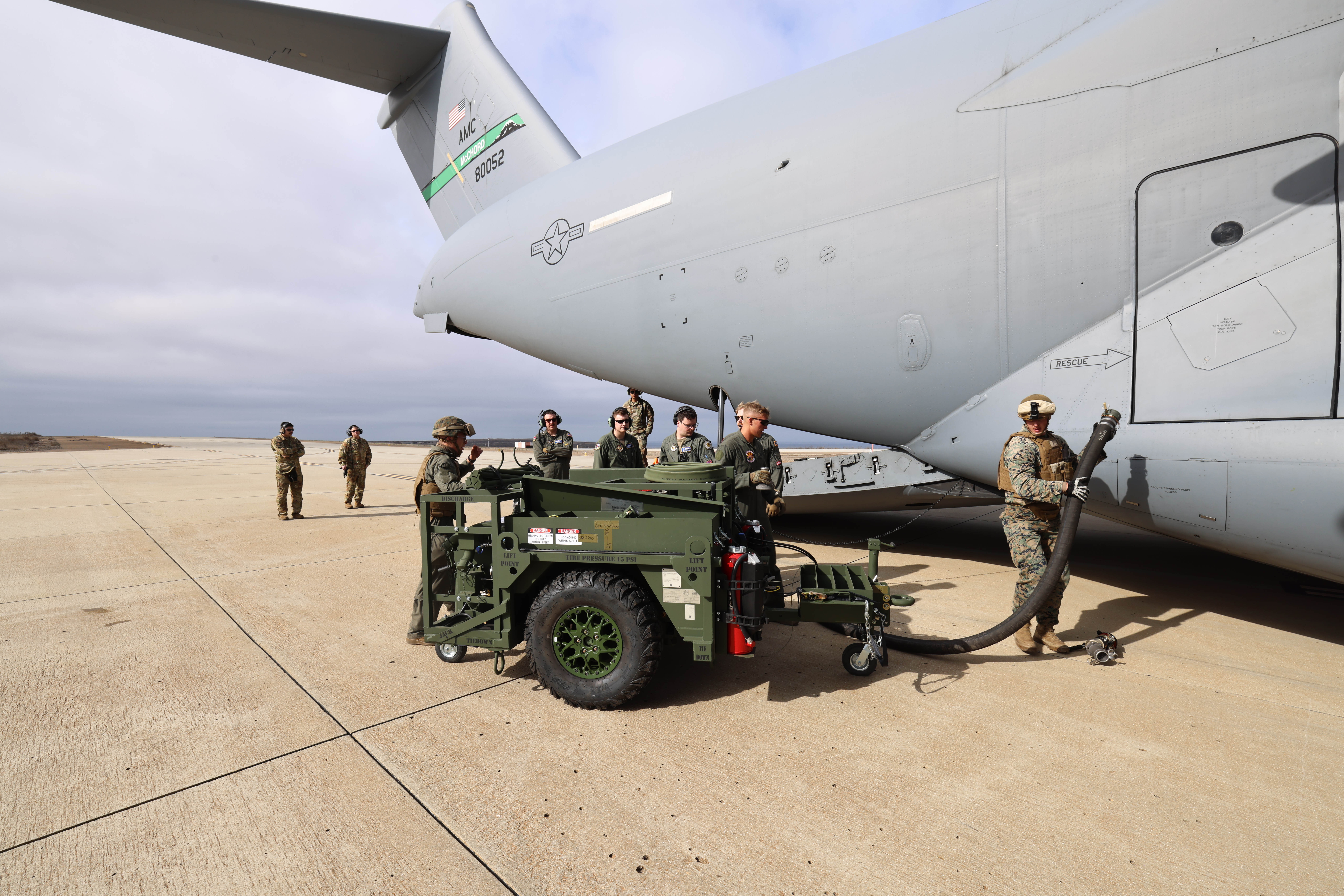 “From the Marine perspective, the C-17 represents tactical fixed-wing heavy lift, which we always welcome in expeditionary mission planning cells. They routinely practice things like high-speed, low-level ingress and egress, and they can carry a ton of stuff. We are employing it to insert my entire Marine Corps team on the objective – all the weapons I would need and the tactical refueling and ground refueling systems to fight and sustain ourselves inside the WEZ [enemy’s weapons engagement zone], all in one C-17. Whatever fuel that they don’t need to get home, we can download that fuel from the C-17 into our fuel bladders to fill fighters,” the squadron commander said. “We set up the base, dump the gas out of the C-17, and then defend it so they can scoot. Once the bladders are filled with C-17 gas, MWSS (Marine Wing Support Squadron) Marines can fill up the F-35s when they cycle down from the overhead CAP (combat air patrol) and really minimize the time we are on deck. Properly configured C-17 and F-35 units make a strong expeditionary fighting team, and we’re really lucky to have those partners in the 97th.”
