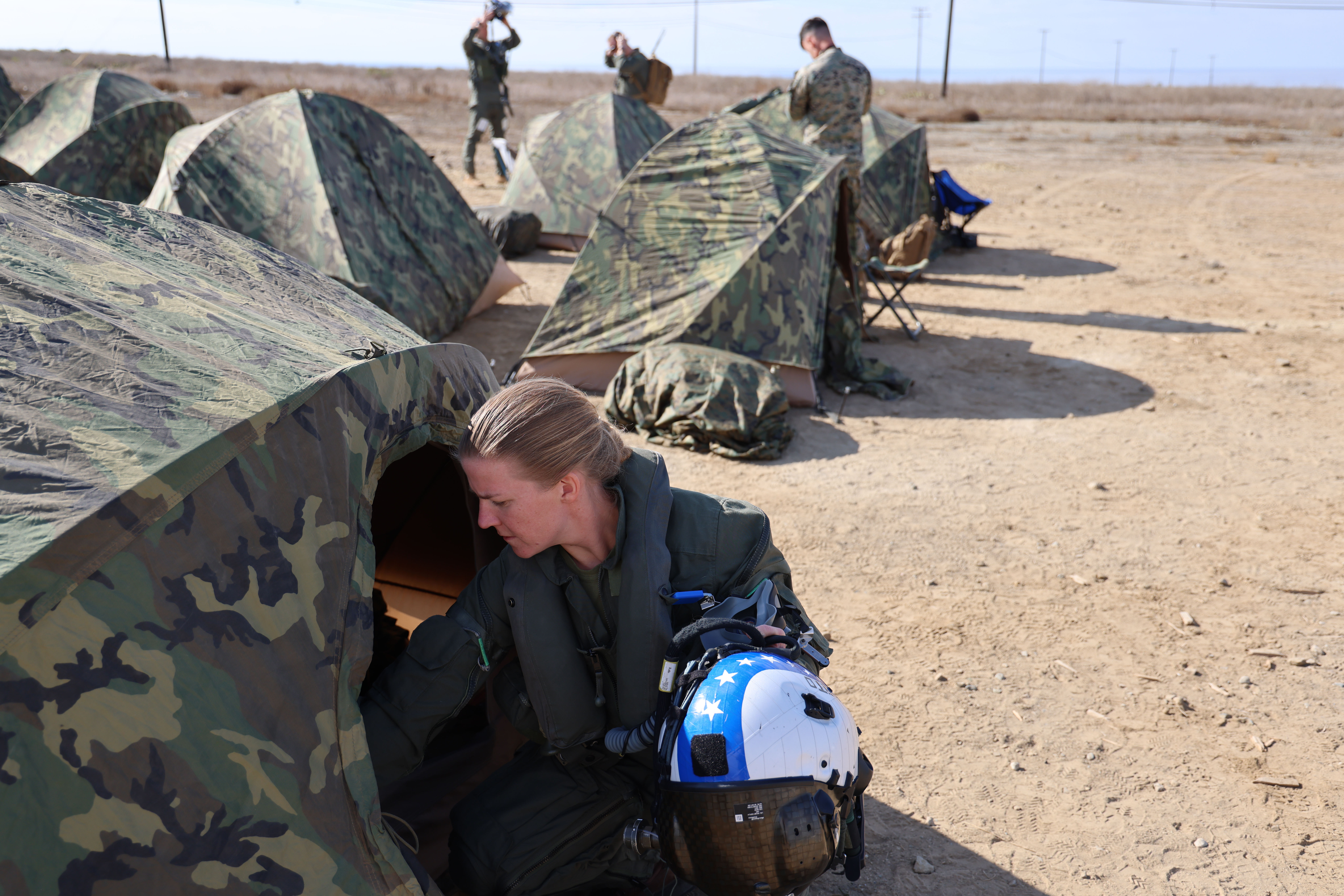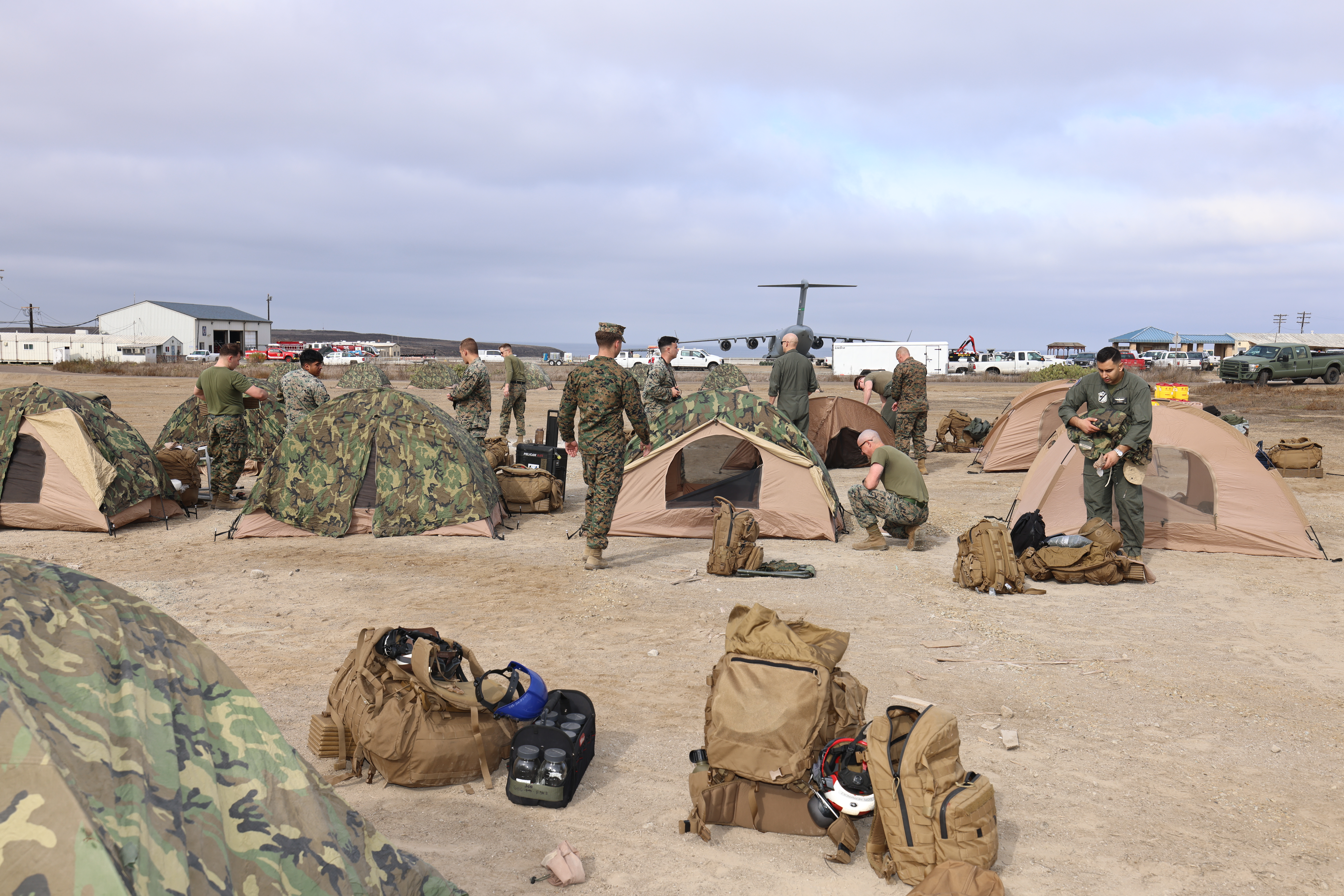 Guyette summed up the experience of the exercise saying, “If my Marines can wake up in a tent, hygiene, shave their face successfully, go out and work on an airplane, and then come back to their bivouac and be comfortable being uncomfortable, and then pack their trash quickly, get in a C-17, and then get out and do it all over again, that’s success for me this week. The high speed, whiz-bang, gee-whiz stuff will come with time. Our pilots are capable of amazing things, but the thing that I personally as a commander really focused on is my corporals and my sergeants. I asked them to shift their mindset from a hangar or a ship, where we have everything we could ever want, into this kind of field environment where they’re aggressively conserving materials and doing without a lot of creature comforts that we normally have. And I think that’s kind of the best part of this job for me as a CO now, is watching the Marines effortlessly do that and be excited to do it because they know it’s realistic. It’s built into them as Marines, and they continue to amaze me after 20 years of watching them.”