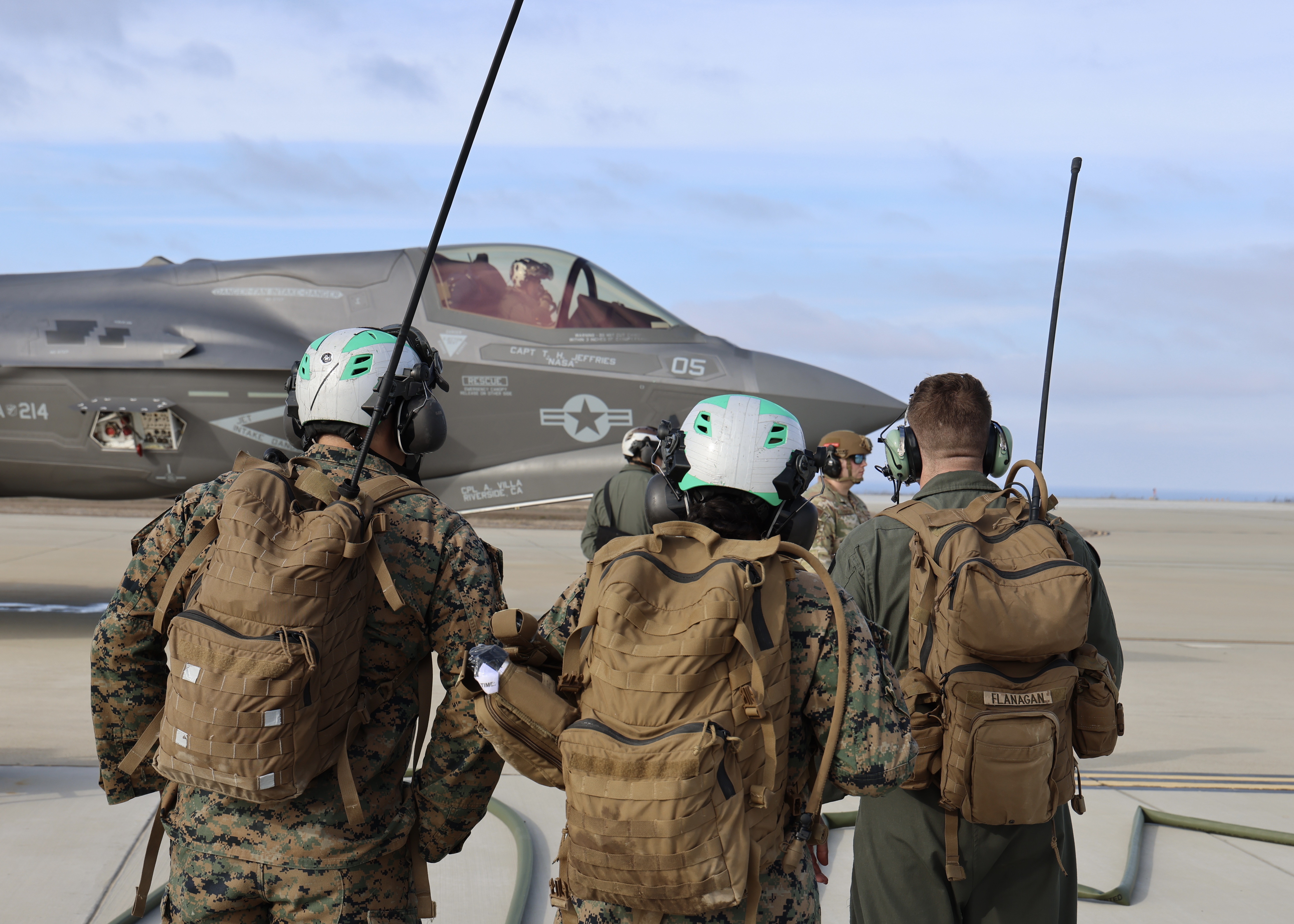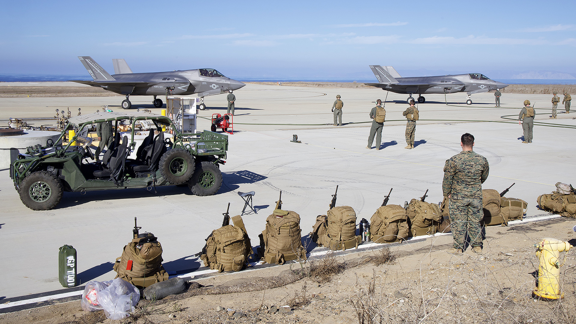 “With some tanking support, we got the band together airborne and executed an offensive counter air (OCA) sweep mission to punch a big hole in that red air picture. Then we got those C-17s ingressed into San Clemente Island, carrying my Black Sheep maintenance team and all of our ordnance, as well as the MWSS-371 Sand Shark Marines and their Tactical Air Ground Refueling System (TAGRS). Once on deck, the Sand Sharks offloaded the gas out of the C-17s and into the TAGRS bladders. While they’re setting that up on the ground, the F-35s overhead shifted to a defensive counter air (DCA) mission to protect the island, as the red air reconstituted for another re-attack. This scenario was modeled after similar … situations we’d see in the real world — the enemy would be made aware that we are there and would not just cede the island, so we’d have to put them in their place again while the Marines below us set up that position. And so, a red air strike package approached, we defended the island, and then recovered the four Black Sheep and two VMX-1 jets for the night.”