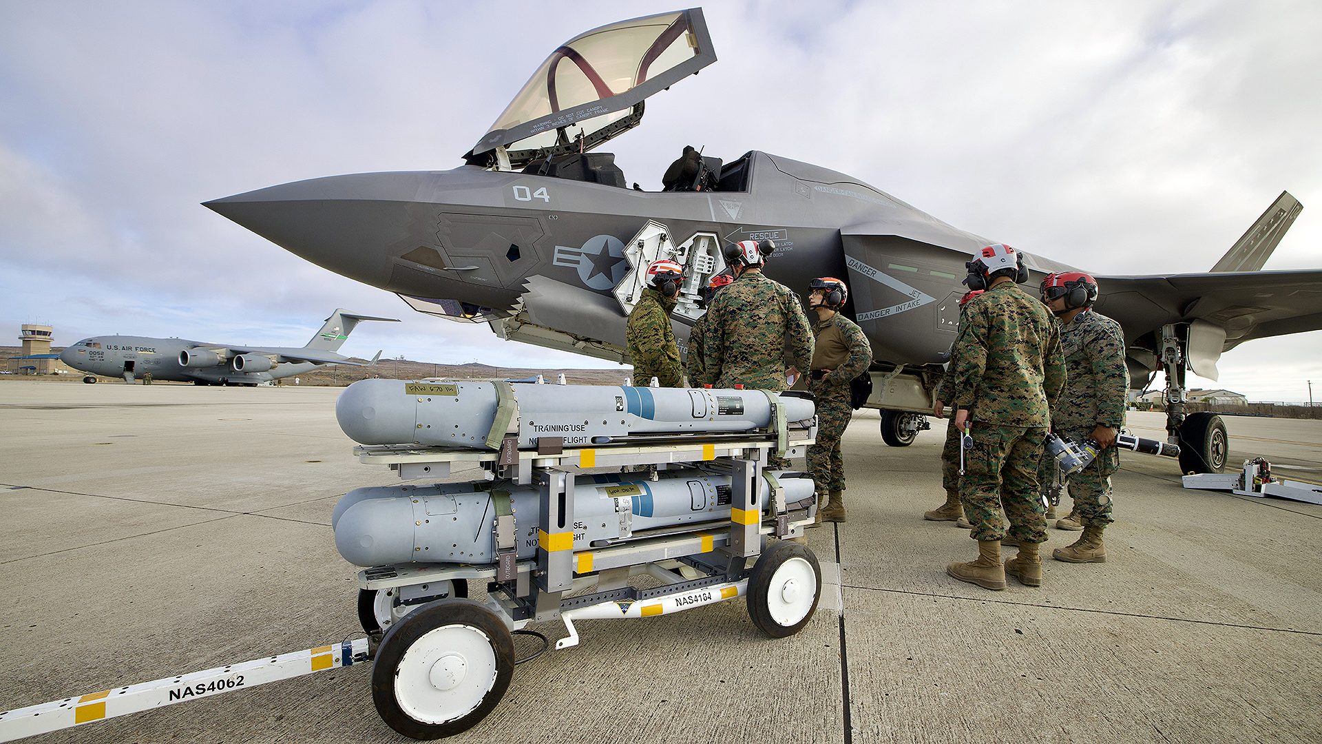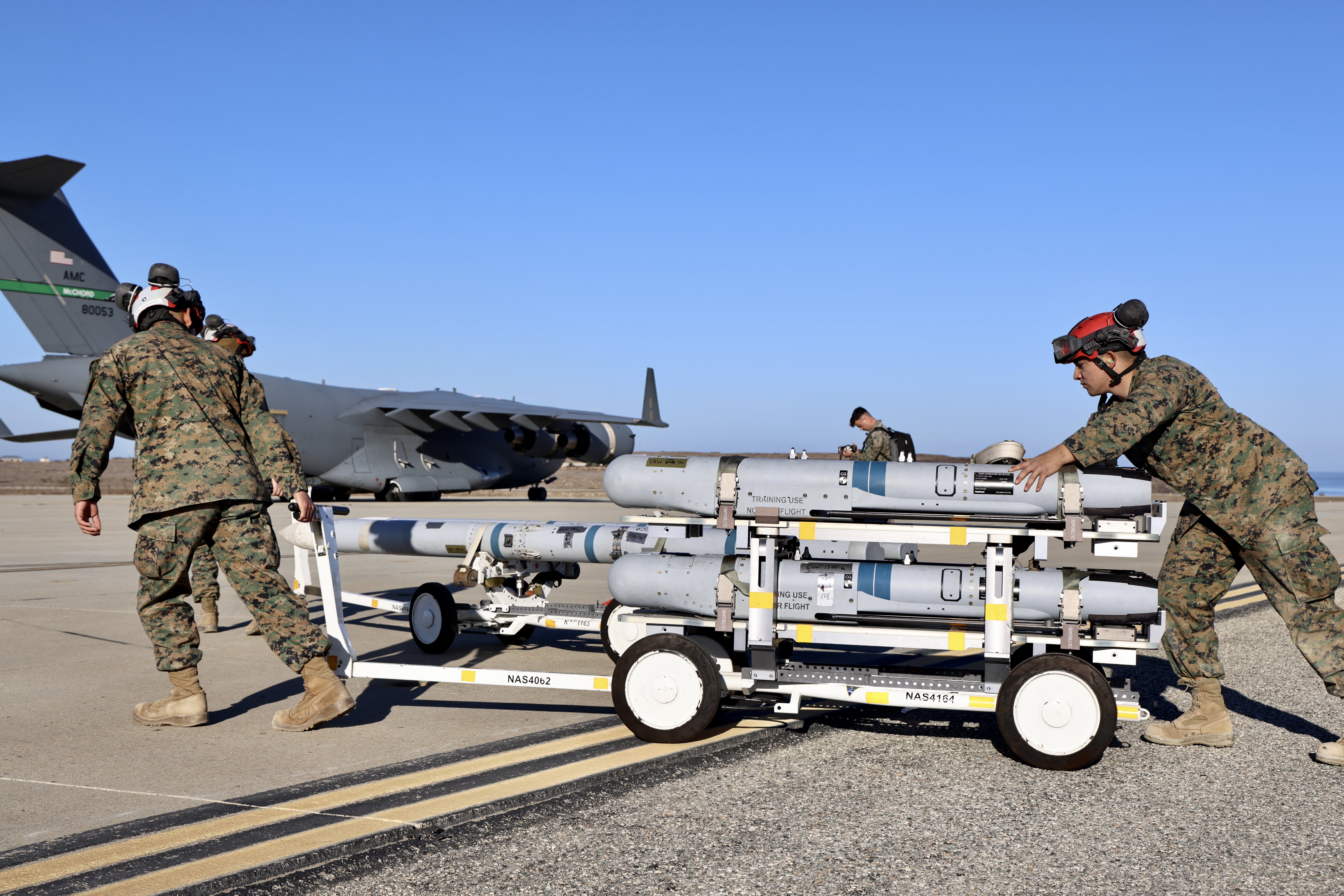 After two C-17s conducted their low-level approach to the island with F-35B cover, they quickly unloaded MWSS Marines and cargo with the help of experienced loadmasters. Three Marine Polaris MRZR all-terrain vehicles towed two TAGRS and several 3,000-gallon fuel bladders off the aircraft and were set up alongside the C-17 within minutes. The other C-17 offloaded maintenance Marines and ordnance, which included several GBU-53 Bravos, also known as Small Diameter Bomb IIs (GBU-53/B, and several AIM-120 air-to-air missiles. Marine F-35Bs can carry eight GBU-53/Bs internally, as well as a pair of AIM-120 AMRAAMs, maintaining their low observable signature. The GBU-53/B can glide for dozens of miles to its target, which can be static or moving, striking with extreme precision and a powerful blast that can even piece some fortified structures.