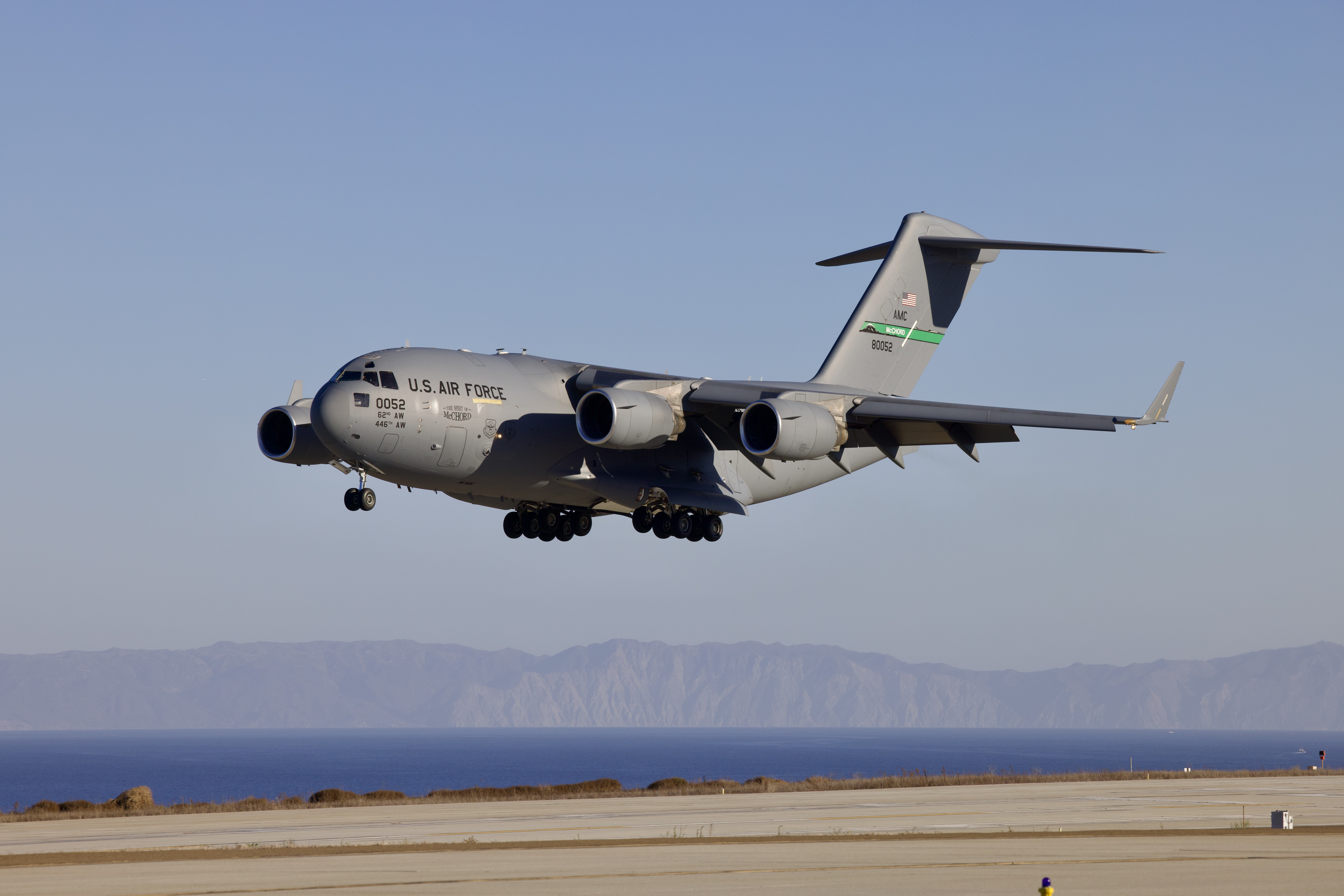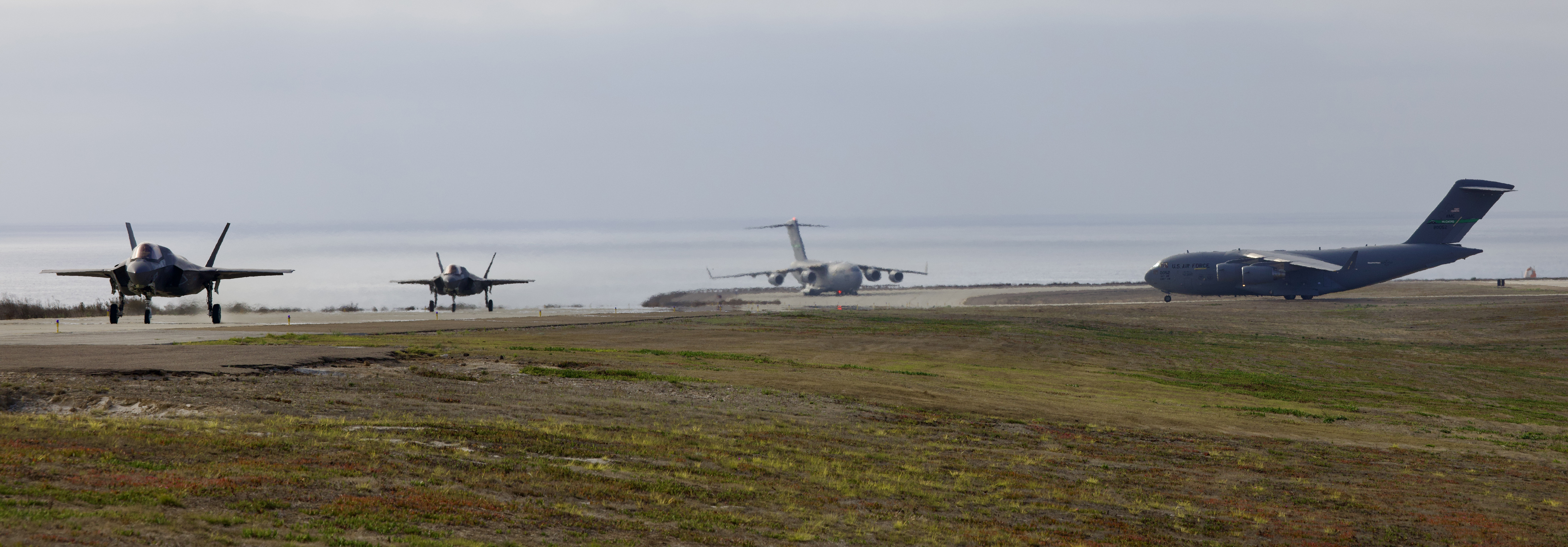 The F-35B and C-17A have more in common than one might think. Each aircraft was designed to operate from remote locales. The design of the C-17 with high-lift wings, slats, powerful engines, and externally blown flaps, allows it to take off and land on runways as short as 3,500 feet. The runways need to be only about 90 feet wide because the aircraft can turn around using a three-point star turn. It also had a unique backing-up capability using thrust reversers, which was demonstrated on the island during the exercise. Maximum payload capacity of the C-17 is 170,000 pounds, and it has space for 18 pallet positions that makes it ideal to help carry the equipment needed for EABO.