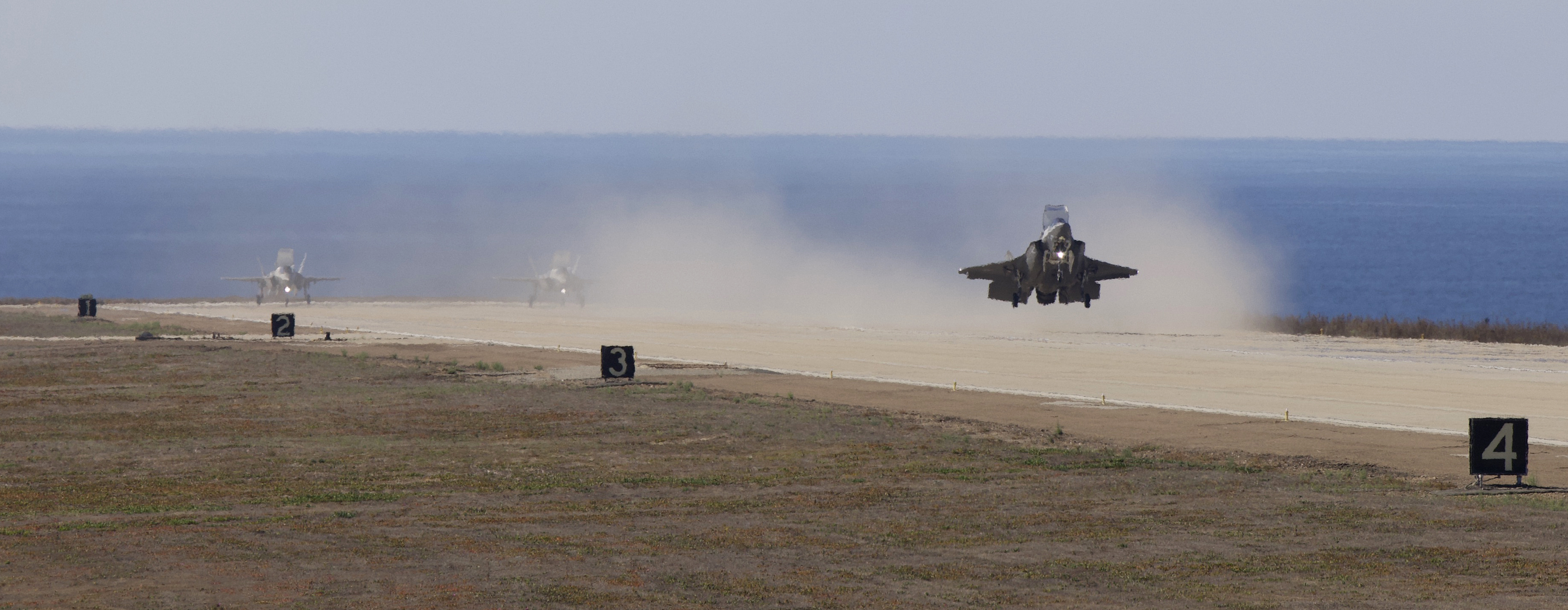 All F-35Bs took off and landed in the Short Take Off and Vertical Landing (STOVL) mode during the exercise. Short takeoffs can lead to issues because, if not done properly, pieces of the runway can break apart and get ingested into the engine or strike the aircraft and nearby assets. Mitigating foreign object debris (FOD) on takeoff, pilots demonstrated the short takeoff (STO) capability of the F-35B, launching their combat-loaded 5th generation fighters from simulated short and narrow runways in less than 1,000 feet using temporary markers on SCI’s main airfield.