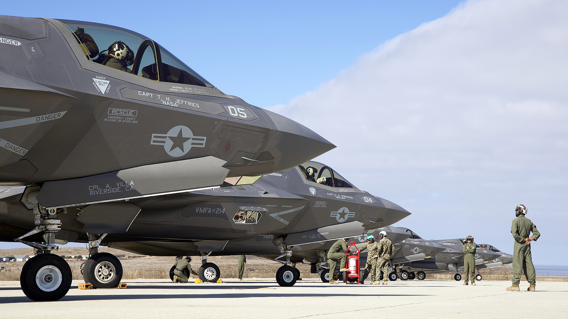 Guyette summed up the mission as “Fight in, fight from, fight out. It’s a three phase-approach that we’re rehearsing this week. We believe that in the next fight, we’re going to have to fight to get to anywhere we go, and the enemy is going to try to hassle us on the way in. Once we get there, we’re going to have to protect ourselves, and we’re going to minimize our time in any one place. We’re going to have to be able to strike from that place and then pack up and then fight our way back out. And so day one of this exercise was an opposed escort of C-17s from Yuma into San Clemente Island. We had four Black Sheep F-35Bs, and two from VMX-1 — the operational test unit in Yuma, and we were up against a large number of what we call red air, or adversary aircraft. We sourced the red air from Marine F/A-18s, F-35s and contract red air from companies like ATAC flying F-21 Kfirs and Hawker Hunters with special mission pods on them. They were simulating a coordinated enemy, trying to protect the island and prevent us from getting the C-17s on there.