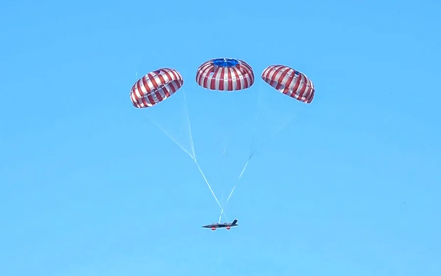 Since its first flight in 2019, the XQ-58’s primary takeoff method has been via a static ground-based launcher with the help of expendable rocket boosters. The Valkyrie, which has no landing gear, gets back down at the end of a sortie using a parachute recovery system. Inflatable air bags help cushion the drone when it hits the ground. Since the new trolley detaches during takeoff, the Valkyrie still lands via parachute when using that new launch method.