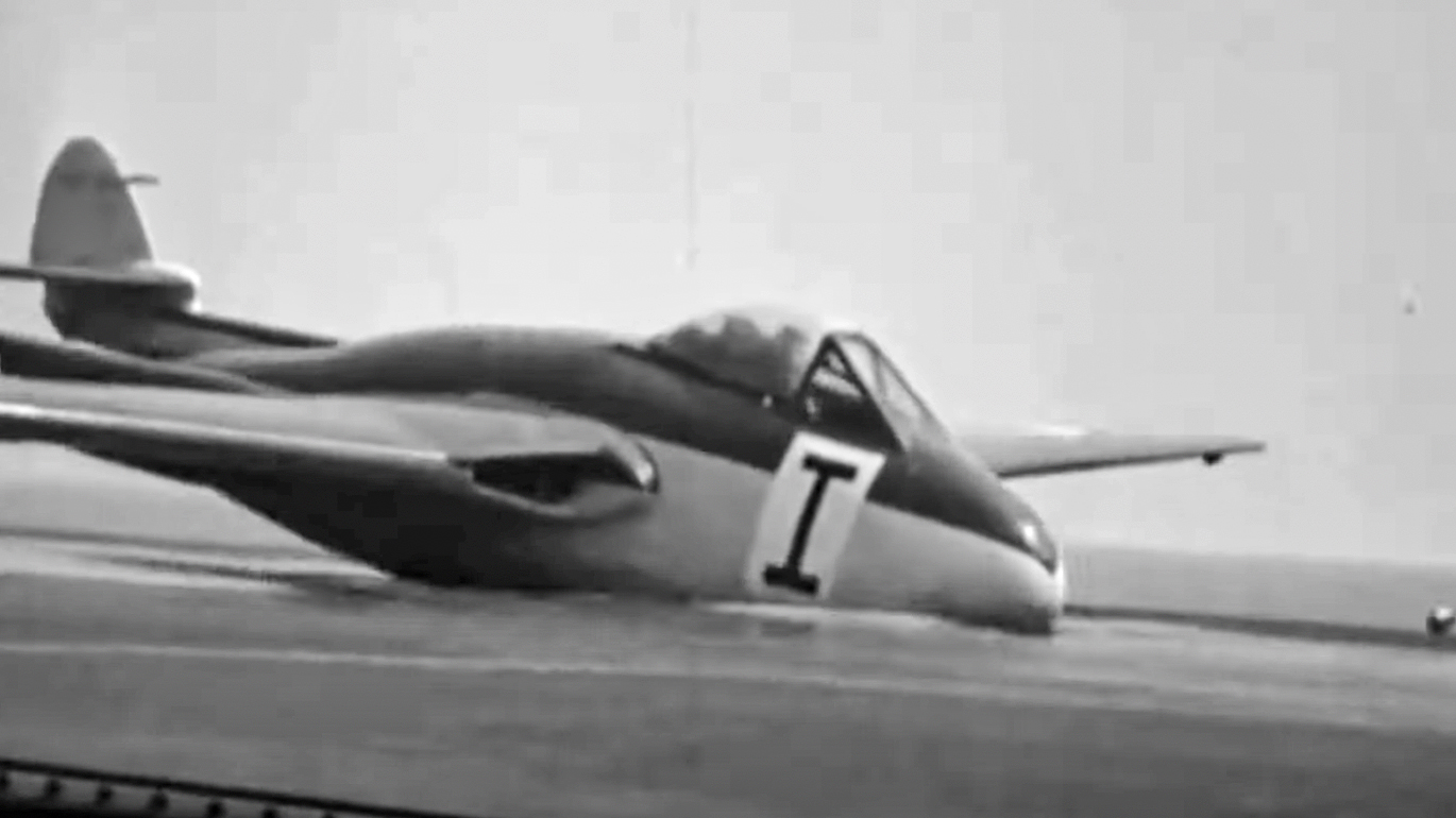 Tests took place aboard Warrior between November 1948 and May 1949, with more than 200 landings ultimately completed both at sea and on land. Pilots involved came from the U.K. Royal Navy and Royal Air Force, and one U.S. Navy test pilot, Lt. Cdr. (later Vice Admiral) Donald D. Engen was also involved.