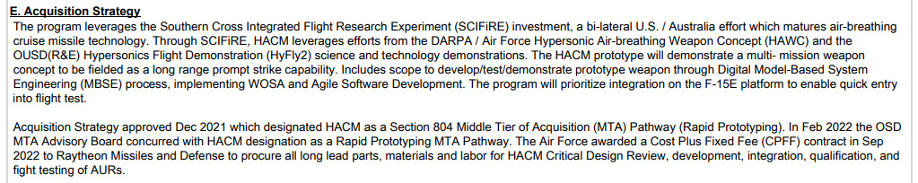 In September 2022, Raytheon won the contract to develop HACM, which is expected to be a waverider-like scramjet-powered design. The Air Force “will prioritize integration on the F-15E [Strike Eagle] platform to enable quick entry into flight test,” according to the service’s proposed Fiscal Year 2024 budget. The expectation is that it will be integrated onto other aircraft after that.