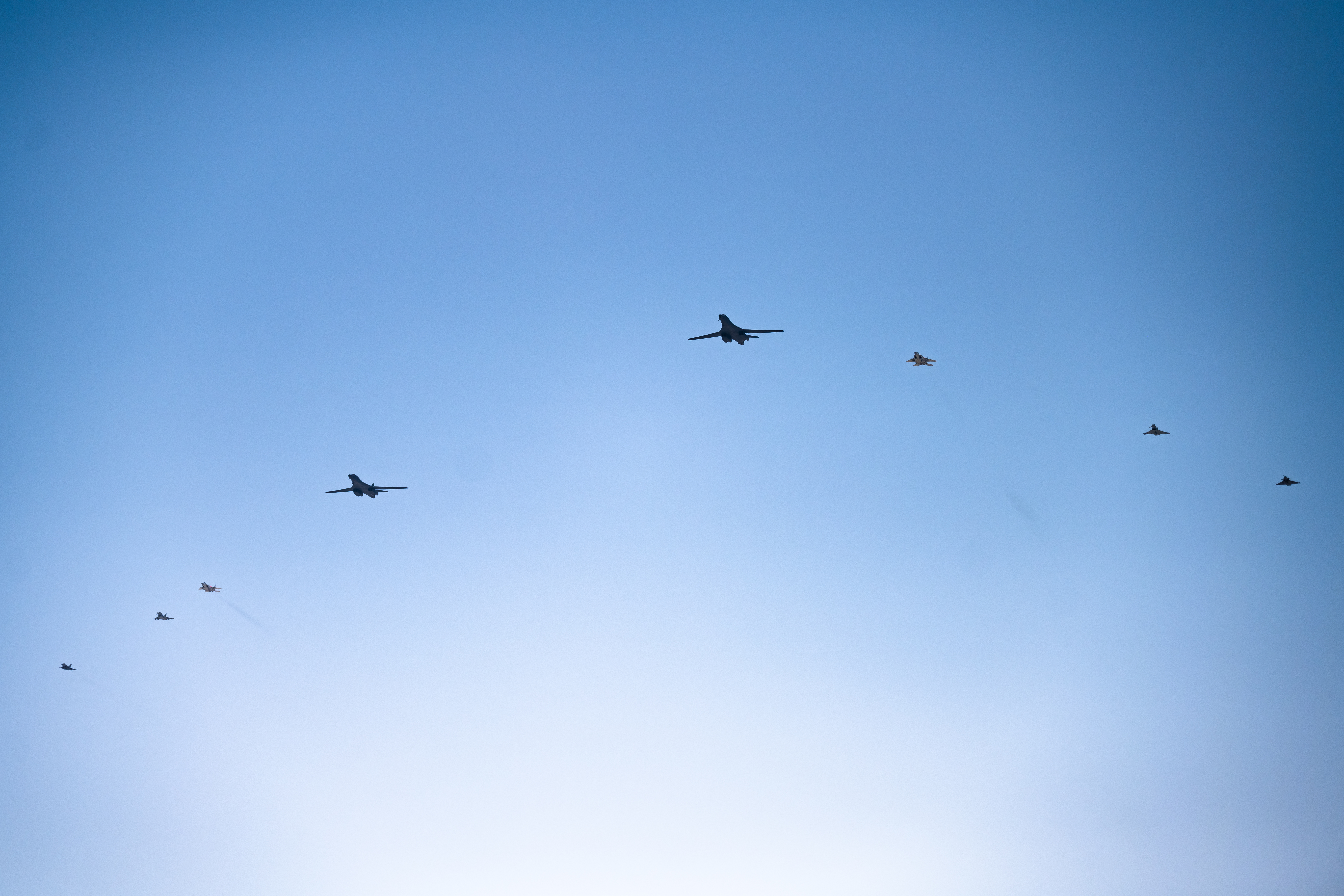 “Ninth Air Force (Air Forces Central) aircraft joined 2 B-1B Lancers assigned to the 9th Expeditionary Bomb Squadron over the U.S. Central Command area of responsibility, along with five partner nations and other coalition forces. This particular BTF mission was historic in that it was the first time AFCENT flew multiple weapons types and practiced employment against multiple simulated targets during single bomber task force mission.”