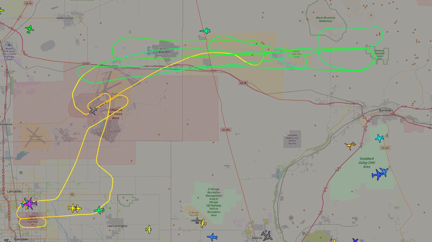 There had already been signs on online flight tracking websites that a B-21 flight from Edwards might be occurring today. A C-12 Huron twin-engine turboprop belonging to the 412th Test Wing and using the callsign Raider 13, which could have been acting as a chase plane, was tracked flying loose orbits north of the base. At the same time, it was also flying at lower attitudes and slower speeds that would pair with initial flight testing envelopes of an aircraft like the B-21. Plane spotters have noted that Raider callsigns has also been used by aircraft conducting more routine training out of Edwards in the past, too.