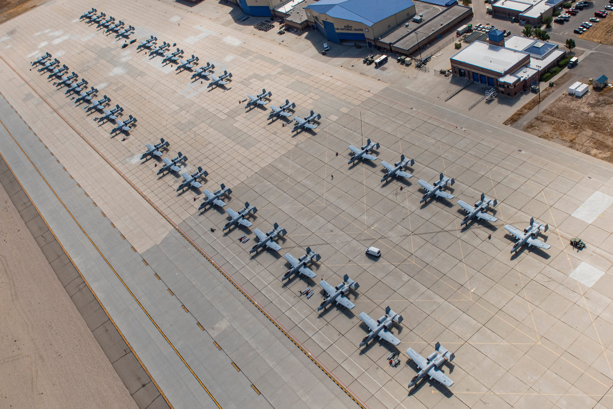 The U.S. Air Force has released a number of striking photos showing 37 A-10 Warthogs in an orderly formation on the flightline at Gowen Field in Boise, Idaho. The Warthogs are from multiple units across the globe, which have gathered in Idaho for the latest iteration of a biennial bombing, missile, and tactical gunnery competition for A-10s dubbed Hawgsmoke.
