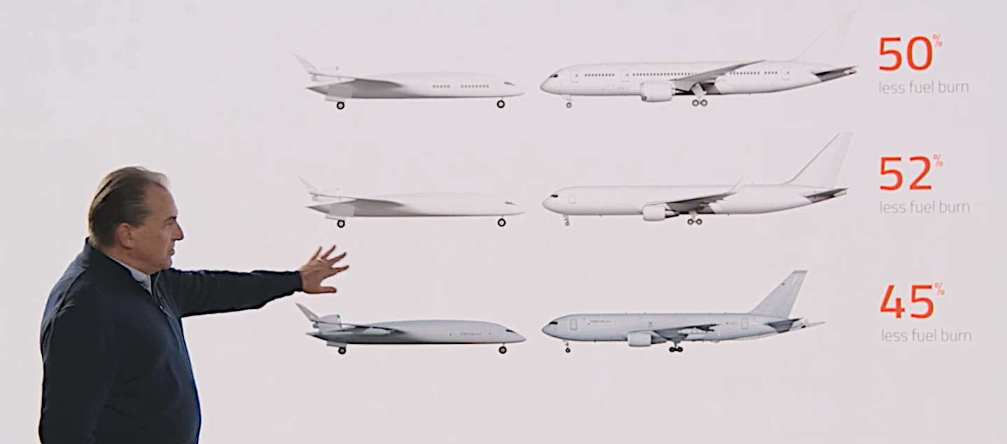 “There are four forces of flight: lift, weight, drag, and thrust. We have a lifting body and a sleek airframe, and it’s going to be made from composite materials – state of the art,” JetZero co-founder and CEO Tom O’Leary explained about the core design concept. “And when we combine the net effects of that, [they] are phenomenal… and that was the lift, and the weight, and the drag. And then we think about thrust. What we can do to an ultra-efficient airframe, being able to have less of a thrust requirement means we’ve actually gotten ourselves into this virtuous cycle where we can use a smaller engine, which is in turn less weight, and less drag.”