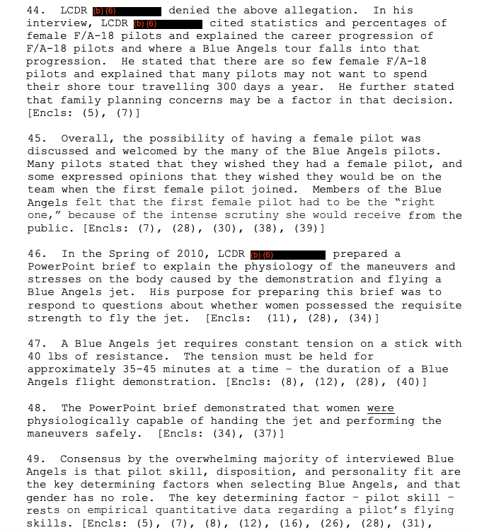 The issue of whether a woman was capable of handling those inputs given the physical strength needed to do so for the duration of a Blue Angels demonstration, generally upwards of 45 minutes, was addressed in the Navy’s findings of a complaint of sexual harassment at the Blue Angels. The report, which found no substantiation of gender discrimination when it came to demo team selection within the Blue Angels, addressed a PowerPoint presentation developed to show the challenges women faced wanting to fly as part of the demonstration team. It found that women were capable of flying jets for the demonstration team. It also found an overwhelming sense from team members that a woman would indeed be welcome:
