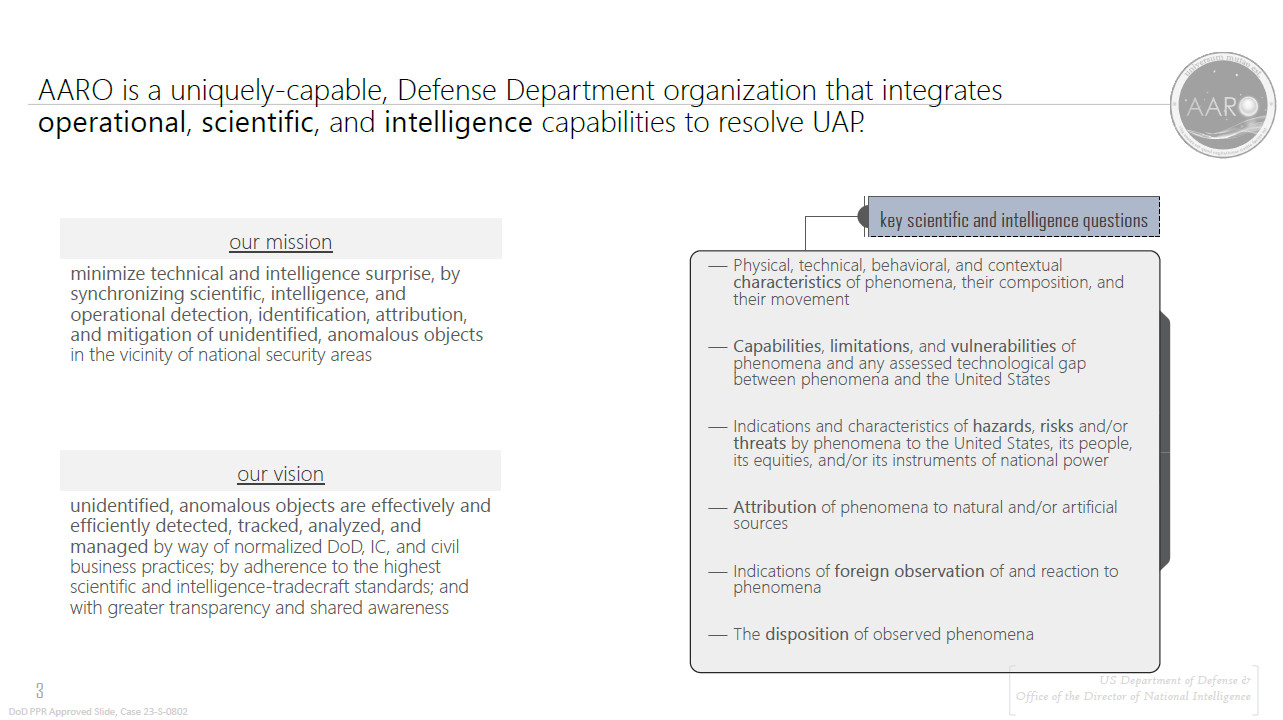 “Minimize technical and intelligence surprise, by synchronizing scientific, intelligence, and operational detection, identification, attribution, and mitigation of unidentified, anomalous objects in the vicinity of national security areas.”