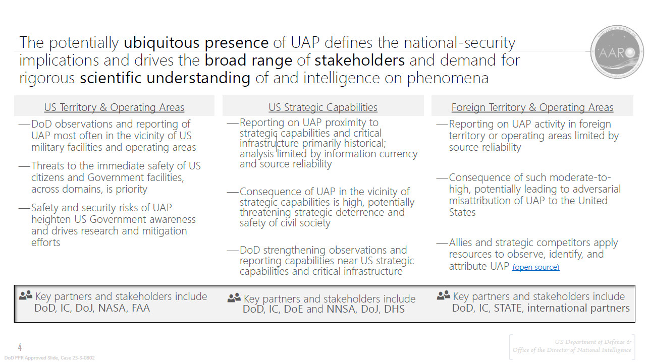 That presentation also included a slide that said “the potentially ubiquitous presence of UAP defines the national-security implications and drives the broad range of stakeholders and demand for rigorous scientific understanding of and intelligence on phenomena.”
